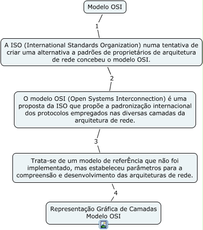 Esse mapa conceitual, produzido no IHMC CmapTools, tem a informação relacionada a: Modelo OSI, Modelo OSI 1 A ISO (International Standards Organization) numa tentativa de criar uma alternativa a padrões de proprietários de arquitetura de rede concebeu o modelo OSI., A ISO (International Standards Organization) numa tentativa de criar uma alternativa a padrões de proprietários de arquitetura de rede concebeu o modelo OSI. 2 O modelo OSI (Open Systems Interconnection) é uma proposta da ISO que propõe a padronização internacional dos protocolos empregados nas diversas camadas da arquitetura de rede., O modelo OSI (Open Systems Interconnection) é uma proposta da ISO que propõe a padronização internacional dos protocolos empregados nas diversas camadas da arquitetura de rede. 3 Trata-se de um modelo de referÊncia que não foi implementado, mas estabeleceu parâmetros para a compreensão e desenvolvimento das arquiteturas de rede., Trata-se de um modelo de referÊncia que não foi implementado, mas estabeleceu parâmetros para a compreensão e desenvolvimento das arquiteturas de rede. 4 Representação Gráfica de Camadas Modelo OSI