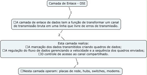 Esse mapa conceitual, produzido no IHMC CmapTools, tem a informação relacionada a: Camada Enlace_OSI, Esta camada realiza: A marcação dos dados transmitidos criando quadros de dados; A regulação do fluxo de dados gerenciando a velocidade e a sequência dos quadros enviados; O controle de acesso ao canal compartilhado. 3 Nesta camada operam: placas de rede, hubs, switches, modems., A camada de enlace de dados tem a função de transformar um canal de transmissão bruta em uma linha que livre de erros de transmissão. 2 Esta camada realiza: A marcação dos dados transmitidos criando quadros de dados; A regulação do fluxo de dados gerenciando a velocidade e a sequência dos quadros enviados; O controle de acesso ao canal compartilhado., Camada de Enlace - OSI 1 A camada de enlace de dados tem a função de transformar um canal de transmissão bruta em uma linha que livre de erros de transmissão.