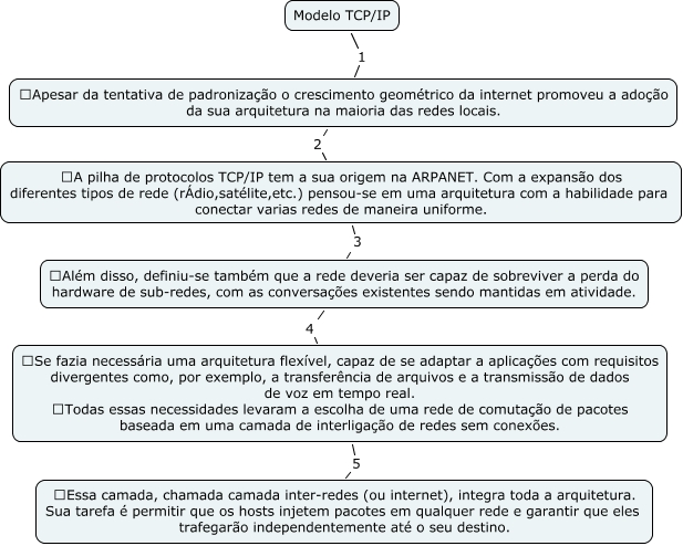 Esse mapa conceitual, produzido no IHMC CmapTools, tem a informação relacionada a: Modelo TCP_IP, Modelo TCP/IP 1 Apesar da tentativa de padronização o crescimento geométrico da internet promoveu a adoção da sua arquitetura na maioria das redes locais., Se fazia necessária uma arquitetura flexível, capaz de se adaptar a aplicações com requisitos divergentes como, por exemplo, a transferência de arquivos e a transmissão de dados de voz em tempo real. Todas essas necessidades levaram a escolha de uma rede de comutação de pacotes baseada em uma camada de interligação de redes sem conexões. 5 Essa camada, chamada camada inter-redes (ou internet), integra toda a arquitetura. Sua tarefa é permitir que os hosts injetem pacotes em qualquer rede e garantir que eles trafegarão independentemente até o seu destino., Além disso, definiu-se também que a rede deveria ser capaz de sobreviver a perda do hardware de sub-redes, com as conversações existentes sendo mantidas em atividade. 4 Se fazia necessária uma arquitetura flexível, capaz de se adaptar a aplicações com requisitos divergentes como, por exemplo, a transferência de arquivos e a transmissão de dados de voz em tempo real. Todas essas necessidades levaram a escolha de uma rede de comutação de pacotes baseada em uma camada de interligação de redes sem conexões., A pilha de protocolos TCP/IP tem a sua origem na ARPANET. Com a expansão dos diferentes tipos de rede (rÁdio,satélite,etc.) pensou-se em uma arquitetura com a habilidade para conectar varias redes de maneira uniforme. 3 Além disso, definiu-se também que a rede deveria ser capaz de sobreviver a perda do hardware de sub-redes, com as conversações existentes sendo mantidas em atividade., Apesar da tentativa de padronização o crescimento geométrico da internet promoveu a adoção da sua arquitetura na maioria das redes locais. 2 A pilha de protocolos TCP/IP tem a sua origem na ARPANET. Com a expansão dos diferentes tipos de rede (rÁdio,satélite,etc.) pensou-se em uma arquitetura com a habilidade para conectar varias redes de maneira uniforme.