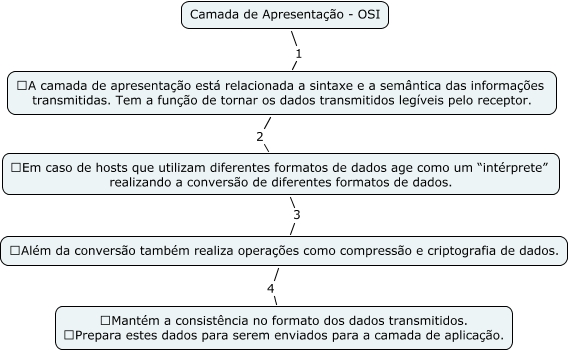Esse mapa conceitual, produzido no IHMC CmapTools, tem a informação relacionada a: Camada Apresentacao_OSI, Camada de Apresentação - OSI 1 A camada de apresentação está relacionada a sintaxe e a semântica das informações transmitidas. Tem a função de tornar os dados transmitidos legíveis pelo receptor., Em caso de hosts que utilizam diferentes formatos de dados age como um “intérprete” realizando a conversão de diferentes formatos de dados. 3 Além da conversão também realiza operações como compressão e criptografia de dados., A camada de apresentação está relacionada a sintaxe e a semântica das informações transmitidas. Tem a função de tornar os dados transmitidos legíveis pelo receptor. 2 Em caso de hosts que utilizam diferentes formatos de dados age como um “intérprete” realizando a conversão de diferentes formatos de dados., Além da conversão também realiza operações como compressão e criptografia de dados. 4 Mantém a consistência no formato dos dados transmitidos. Prepara estes dados para serem enviados para a camada de aplicação.