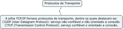 Esse mapa conceitual, produzido no IHMC CmapTools, tem a informação relacionada a: Protocolos de Transporte, Protocolos de Transporte 1 A pilha TCP/IP fornece protocolos de transporte, dentre os quais destacam-se: UDP (User Datagram Protocol): serviço não-confiável e não orientado a conexão. TCP (Transmission Control Protocol): serviço confiável e orientado a conexão.
