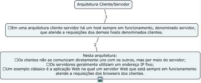 Esse mapa conceitual, produzido no IHMC CmapTools, tem a informação relacionada a: Arquitetura Cliente_Servidor, Em uma arquitetura cliente-servidor há um host sempre em funcionamento, denominado servidor, que atende a requisições dos demais hosts denominados clientes. 2 Nesta arquitetura: Os clientes não se comunicam diretamente uns com os outros, mas por meio do servidor; Os servidores geralmente utilizam um endereço IP fixo; Um exemplo clássico é a aplicação Web na qual um servidor Web que está sempre em funcionamento atende a requisições dos browsers dos clientes., Arquitetura Cliente/Servidor 1 Em uma arquitetura cliente-servidor há um host sempre em funcionamento, denominado servidor, que atende a requisições dos demais hosts denominados clientes.