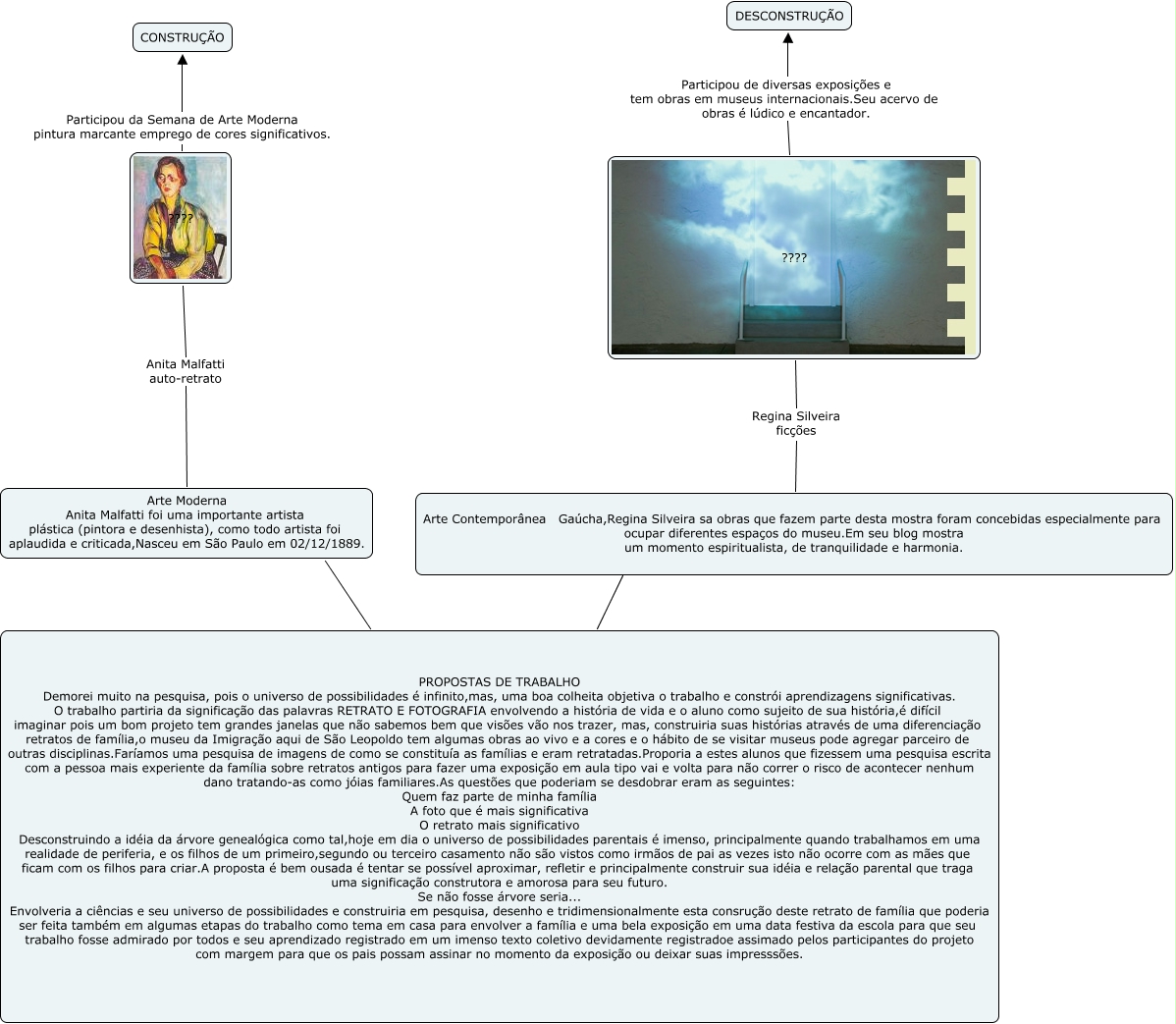 Esse mapa conceitual, produzido no IHMC CmapTools, tem a informação relacionada a: construção e desconstrução, PROPOSTAS DE TRABALHO Demorei muito na pesquisa, pois o universo de possibilidades é infinito,mas, uma boa colheita objetiva o trabalho e constrói aprendizagens significativas. O trabalho partiria da significação das palavras RETRATO E FOTOGRAFIA envolvendo a história de vida e o aluno como sujeito de sua história,é difícil imaginar pois um bom projeto tem grandes janelas que não sabemos bem que visões vão nos trazer, mas, construiria suas histórias através de uma diferenciação retratos de família,o museu da Imigração aqui de São Leopoldo tem algumas obras ao vivo e a cores e o hábito de se visitar museus pode agregar parceiro de outras disciplinas.Faríamos uma pesquisa de imagens de como se constituía as famílias e eram retratadas.Proporia a estes alunos que fizessem uma pesquisa escrita com a pessoa mais experiente da família sobre retratos antigos para fazer uma exposição em aula tipo vai e volta para não correr o risco de acontecer nenhum dano tratando-as como jóias familiares.As questões que poderiam se desdobrar eram as seguintes: Quem faz parte de minha família A foto que é mais significativa O retrato mais significativo Desconstruindo a idéia da árvore genealógica como tal,hoje em dia o universo de possibilidades parentais é imenso, principalmente quando trabalhamos em uma realidade de periferia, e os filhos de um primeiro,segundo ou terceiro casamento não são vistos como irmãos de pai as vezes isto não ocorre com as mães que ficam com os filhos para criar.A proposta é bem ousada é tentar se possível aproximar, refletir e principalmente construir sua idéia e relação parental que traga uma significação construtora e amorosa para seu futuro. Se não fosse árvore seria... Envolveria a ciências e seu universo de possibilidades e construiria em pesquisa, desenho e tridimensionalmente esta consrução deste retrato de família que poderia ser feita também em algumas etapas do trabalho como tema em casa para envolver a família e uma bela exposição em uma data festiva da escola para que seu trabalho fosse admirado por todos e seu aprendizado registrado em um imenso texto coletivo devidamente registradoe assimado pelos participantes do projeto com margem para que os pais possam assinar no momento da exposição ou deixar suas impresssões. ???? Arte Moderna Anita Malfatti foi uma importante artista plástica (pintora e desenhista), como todo artista foi aplaudida e criticada,Nasceu em São Paulo em 02/12/1889., ???? Regina Silveira ficções Arte Contemporânea Gaúcha,Regina Silveira sa obras que fazem parte desta mostra foram concebidas especialmente para ocupar diferentes espaços do museu.Em seu blog mostra um momento espiritualista, de tranquilidade e harmonia., PROPOSTAS DE TRABALHO Demorei muito na pesquisa, pois o universo de possibilidades é infinito,mas, uma boa colheita objetiva o trabalho e constrói aprendizagens significativas. O trabalho partiria da significação das palavras RETRATO E FOTOGRAFIA envolvendo a história de vida e o aluno como sujeito de sua história,é difícil imaginar pois um bom projeto tem grandes janelas que não sabemos bem que visões vão nos trazer, mas, construiria suas histórias através de uma diferenciação retratos de família,o museu da Imigração aqui de São Leopoldo tem algumas obras ao vivo e a cores e o hábito de se visitar museus pode agregar parceiro de outras disciplinas.Faríamos uma pesquisa de imagens de como se constituía as famílias e eram retratadas.Proporia a estes alunos que fizessem uma pesquisa escrita com a pessoa mais experiente da família sobre retratos antigos para fazer uma exposição em aula tipo vai e volta para não correr o risco de acontecer nenhum dano tratando-as como jóias familiares.As questões que poderiam se desdobrar eram as seguintes: Quem faz parte de minha família A foto que é mais significativa O retrato mais significativo Desconstruindo a idéia da árvore genealógica como tal,hoje em dia o universo de possibilidades parentais é imenso, principalmente quando trabalhamos em uma realidade de periferia, e os filhos de um primeiro,segundo ou terceiro casamento não são vistos como irmãos de pai as vezes isto não ocorre com as mães que ficam com os filhos para criar.A proposta é bem ousada é tentar se possível aproximar, refletir e principalmente construir sua idéia e relação parental que traga uma significação construtora e amorosa para seu futuro. Se não fosse árvore seria... Envolveria a ciências e seu universo de possibilidades e construiria em pesquisa, desenho e tridimensionalmente esta consrução deste retrato de família que poderia ser feita também em algumas etapas do trabalho como tema em casa para envolver a família e uma bela exposição em uma data festiva da escola para que seu trabalho fosse admirado por todos e seu aprendizado registrado em um imenso texto coletivo devidamente registradoe assimado pelos participantes do projeto com margem para que os pais possam assinar no momento da exposição ou deixar suas impresssões. ???? Arte Contemporânea Gaúcha,Regina Silveira sa obras que fazem parte desta mostra foram concebidas especialmente para ocupar diferentes espaços do museu.Em seu blog mostra um momento espiritualista, de tranquilidade e harmonia., ???? Participou de diversas exposições e tem obras em museus internacionais.Seu acervo de obras é lúdico e encantador. DESCONSTRUÇÃO, ???? Participou da Semana de Arte Moderna pintura marcante emprego de cores significativos. CONSTRUÇÃO, ???? Anita Malfatti auto-retrato Arte Moderna Anita Malfatti foi uma importante artista plástica (pintora e desenhista), como todo artista foi aplaudida e criticada,Nasceu em São Paulo em 02/12/1889.