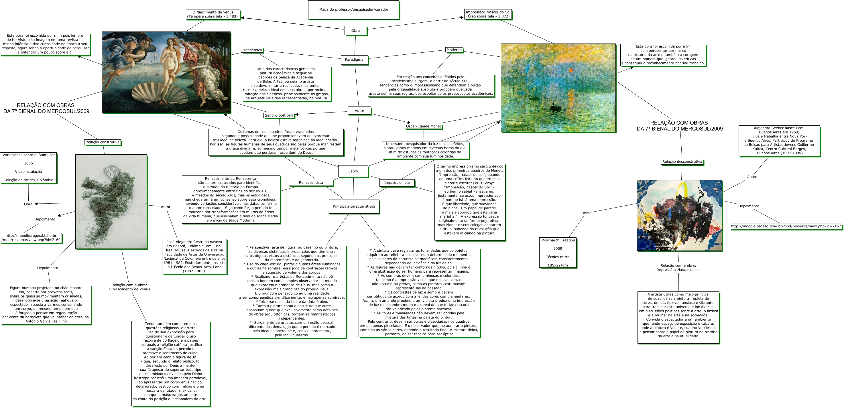 Esse mapa conceitual, produzido no IHMC CmapTools, tem a informação relacionada a: O curador de artes visuais 2 - Bienal, O Nascimento de vênus (Têmpera sobre tela - 1.483) Obra Impressão: Nascer do Sol (Óleo sobre tela - 1.872), O termo impressionismo surgiu devido a um dos primeiros quadros de Monet, "Impressão, nascer do sol", quando de uma crítica feita ao quadro pelo pintor e escritor Louis Leroy: "Impressão, nascer do Sol�? – eu bem o sabia! Pensava eu, justamente, se estou impressionado é porque há lá uma impressão. E que liberdade, que suavidade de pincel! Um papel de parede é mais elaborado que esta cena marinha." . A expressão foi usada originalmente de forma pejorativa, mas Monet e seus colegas adotaram o título, sabendo da revolução que estavam iniciando na pintura. ???? Impressionista, Acadêmico ????, Autor ???? Alejandra Seeber nasceu em Buenos Aires,em 1969; vive e trabalha entre Nova York e Buenos Aires. Participou do Programa de Bolsas para Artistas Jovens Guillermo Kuitca, Centro Cultural Borges, Buenos Aires (1997-1999), Autor ???? Obra, Relação com a obra: O Nascimento de Vênus ???? Obra, Paradigma Autor Oscar-Claude Monet, Obra Roscharch Creation 2009 Técnica mista 185x224cm, Estilo Principais características * Perspectiva: arte de figura, no desenho ou pintura, as diversas distâncias e proporções que têm entre si os objetos vistos à distância, segundo os princípios da matemática e da geometria. * Uso do claro-escuro: pintar algumas áreas iluminadas e outras na sombra, esse jogo de contrastes reforça a sugestão de volume dos corpos. * Realismo: o artistas do Renascimento não vê mais o homem como simples observador do mundo que expressa a grandeza de Deus, mas como a expressão mais grandiosa do próprio Deus. E o mundo é pensado como uma realidade a ser compreendida cientificamente, e não apenas admirada. * Inicia-se o uso da tela e da tinta à óleo. * Tanto a pintura como a escultura que antes apareciam quase que exclusivamente como detalhes de obras arquitetônicas, tornam-se manifestações independentes. * Surgimento de artistas com um estilo pessoal, diferente dos demais, já que o período é marcado pelo ideal de liberdade e, conseqüentemente, pelo individualismo., Estilo Principais características * A pintura deve registrar as tonalidades que os objetos adquirem ao refletir a luz solar num determinado momento, pois as cores da natureza se modificam constantemente, dependendo da incidência da luz do sol. * As figuras não devem ter contornos nítidos, pois a linha é uma abstração do ser humano para representar imagens. * As sombras devem ser luminosas e coloridas, tal como é a impressão visual que nos causam, e não escuras ou pretas, como os pintores costumavam representá-las no passado. * Os contrastes de luz e sombra devem ser obtidos de acordo com a lei das cores complementares. Assim, um amarelo próximo a um violeta produz uma impressão de luz e de sombra muito mais real do que o claro-escuro tão valorizado pelos pintores barrocos. * As cores e tonalidades não devem ser obtidas pela mistura das tintas na paleta do pintor. Pelo contrário, devem ser puras e dissociadas nos quadros em pequenas pinceladas. É o observador que, ao admirar a pintura, combina as várias cores, obtendo o resultado final. A mistura deixa, portanto, de ser técnica para ser óptica., Depoimento http://moodle.regesd.tche.br/mod/resource/view.php?id=7167, Estilo Principais características, Relação construtiva ???? Depoimento, Depoimento ???? Figura humana projetada no chão e sobre ela, coberta por gravetos reais, sobre os quais se movimentam crisálidas, desenvolve-se uma ação real que o espectador associa a vermes consumindo um corpo, ao mesmo tempo em que é forçado a pensar em regeneração por conta da borboleta que vai nascer da crisálida. Antônio Gonçalves Filho, Acadêmico ???? Uma das características gerais da pintura acadêmica é seguir os padrões de beleza da Academia de Belas Artes, ou seja, o artista não deve imitar a realidade, mas tentar recriar a beleza ideal em suas obras, por meio da imitação dos clássicos, principalmente os gregos, na arquitetura e dos renascentistas, na pintura., Paradigma ???? Moderno, Autor ???? Depoimento, Relação com a obra: O Nascimento de Vênus ???? Depoimento, Relação com a obra: O Nascimento de Vênus ???? Depoimento, Paradigma Autor Estilo