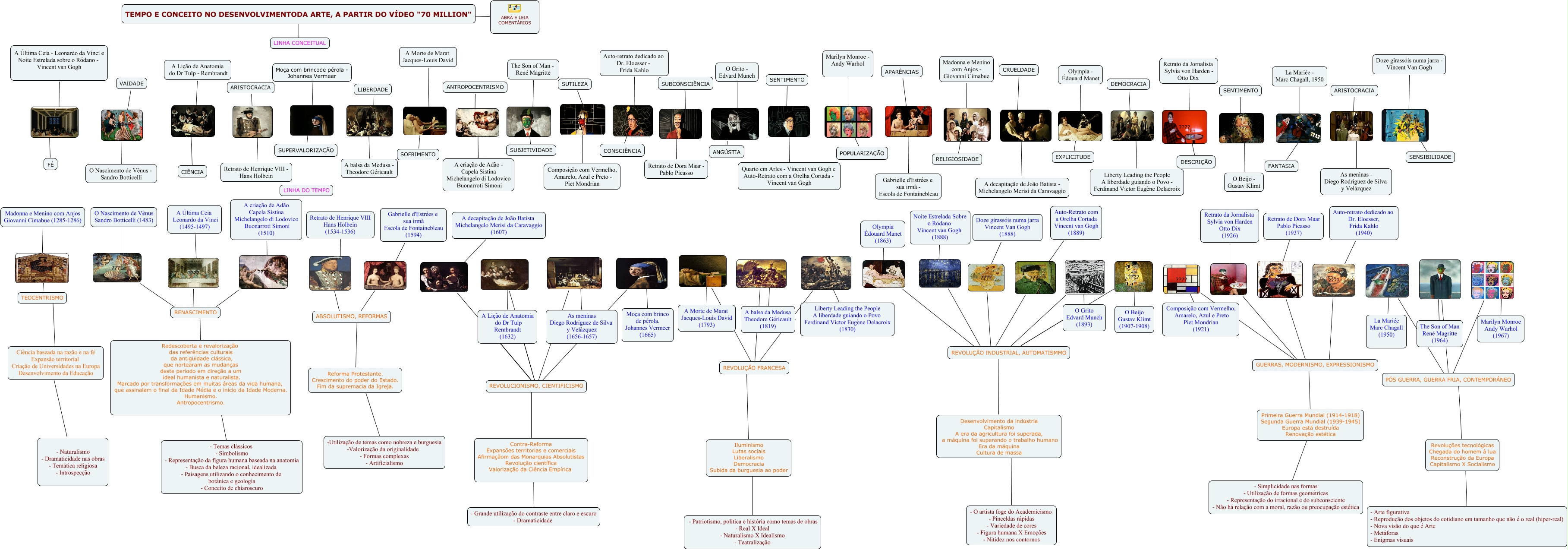 Esse mapa conceitual, produzido no IHMC CmapTools, tem a informação relacionada a: Tempo e Conceito no desenvolvimento da Arte, a partir do video 70 million, ???? ???? REVOLUÇÃO INDUSTRIAL, AUTOMATISMMO, Marilyn Monroe Andy Warhol (1967) ???? ????, ???? ???? ABSOLUTISMO, REFORMAS, As meninas - Diego Rodríguez de Silva y Velázquez ???? ????, ???? ???? ABSOLUTISMO, REFORMAS, Doze girassóis numa jarra Vincent Van Gogh (1888) ???? ????, ???? ???? RENASCIMENTO, ???? ???? REVOLUCIONISMO, CIENTIFICISMO, A balsa da Medusa Theodore Géricault (1819) ???? ????, Auto-Retrato com a Orelha Cortada Vincent van Gogh (1889) ???? ????, ???? ???? REVOLUCIONISMO, CIENTIFICISMO, SUTILEZA ???? ????, ???? ???? REVOLUCIONISMO, CIENTIFICISMO, ???? ???? GUERRAS, MODERNISMO, EXPRESSIONISMO, ARISTOCRACIA ???? ????, O Nascimento de Vênus Sandro Botticelli (1483) ???? ????, A Lição de Anatomia do Dr Tulp - Rembrandt ???? ????, - Simplicidade nas formas - Utilização de formas geométricas - Representação do irracional e do subconsciente - Não há relação com a moral, razão ou preocupação estética ???? Primeira Guerra Mundial (1914-1918) Segunda Guerra Mundial (1939-1945) Europa está destruída Renovação estética, ???? ???? REVOLUÇÃO INDUSTRIAL, AUTOMATISMMO, CIÊNCIA ???? ????