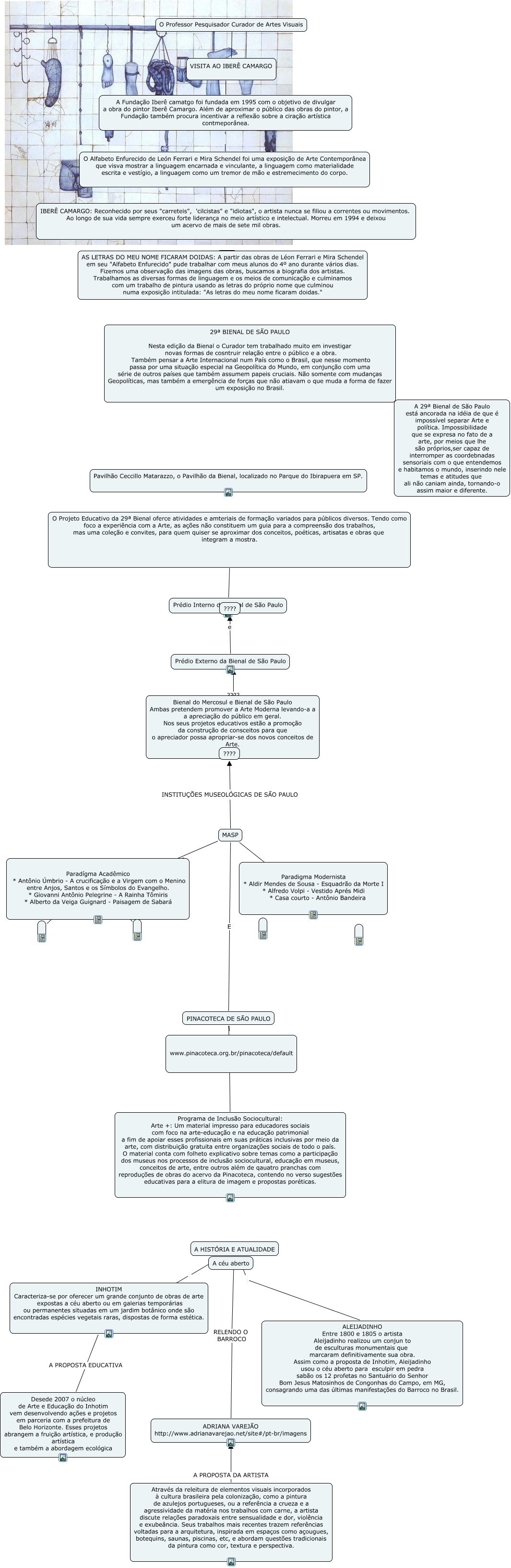Esse mapa conceitual, produzido no IHMC CmapTools, tem a informação relacionada a: O professor pesquisador curador de Artes Visuais, Através da releitura de elementos visuais incorporados à cultura brasileira pela colonização, como a pintura de azulejos portugueses, ou a referência a crueza e a agressividade da matéria nos trabalhos com carne, a artista discute relações paradoxais entre sensualidade e dor, violência e exubeância. Seus trabalhos mais recentes trazem referências voltadas para a arquitetura, inspirada em espaços como açougues, botequins, saunas, piscinas, etc, e abordam questões tradicionais da pintura como cor, textura e perspectiva. A PROPOSTA DA ARTISTA ADRIANA VAREJÃO http://www.adrianavarejao.net/site#/pt-br/imagens, MASP ???? Paradígma Acadêmico * Antônio Úmbrio - A crucificação e a Virgem com o Menino entre Anjos, Santos e os Símbolos do Evangelho. * Giovanni Antônio Pelegrine - A Rainha Tômiris * Alberto da Veiga Guignard - Paisagem de Sabará, ???? Paradígma Acadêmico * Antônio Úmbrio - A crucificação e a Virgem com o Menino entre Anjos, Santos e os Símbolos do Evangelho. * Giovanni Antônio Pelegrine - A Rainha Tômiris * Alberto da Veiga Guignard - Paisagem de Sabará, MASP ???? Paradigma Modernista * Aldir Mendes de Sousa - Esquadrão da Morte I * Alfredo Volpi - Vestido Aprés Midi * Casa courto - Antônio Bandeira, ADRIANA VAREJÃO http://www.adrianavarejao.net/site#/pt-br/imagens RELENDO O BARROCO A HISTÓRIA E ATUALIDADE, PINACOTECA DE SÃO PAULO ???? Programa de Inclusão Sociocultural: Arte +: Um material impresso para educadores sociais com foco na arte-educação e na educação patrimonial a fim de apoiar esses profissionais em suas práticas inclusivas por meio da arte, com distribuição gratuita entre organizações sociais de todo o país. O material conta com folheto explicativo sobre temas como a participação dos museus nos processos de inclusão sociocultural, educação em museus, conceitos de arte, entre outros além de qauatro pranchas com reproduções de obras do acervo da Pinacoteca, contendo no verso sugestões educativas para a elitura de imagem e propostas poréticas., VISITA AO IBERÊ CAMARGO A Fundação Iberê camatgo foi fundada em 1995 com o objetivo de divulgar a obra do pintor Iberê Camargo. Além de aproximar o público das obras do pintor, a Fundação também procura incentivar a reflexão sobre a ciração artística contmeporânea., O Alfabeto Enfurecido de León Ferrari e Mira Schendel foi uma exposição de Arte Contemporânea que visva mostrar a linguagem encarnada e vinculante, a linguagem como materialidade escrita e vestígio, a linguagem como um tremor de mão e estremecimento do corpo. ???? IBERÊ CAMARGO: Reconhecido por seus "carreteis", 'cilcistas" e "idiotas", o artista nunca se filiou a correntes ou movimentos. Ao longo de sua vida sempre exerceu forte liderança no meio artístico e intelectual. Morreu em 1994 e deixou um acervo de mais de sete mil obras., O Professor Pesquisador Curador de Artes Visuais ???? VISITA AO IBERÊ CAMARGO, Prédio Interno da Bienal de São Paulo ???? O Projeto Educativo da 29ª Bienal oferce atividades e amteriais de formação variados para públicos diversos. Tendo como foco a experiência com a Arte, as ações não constituem um guia para a compreensão dos trabalhos, mas uma coleção e convites, para quem quiser se aproximar dos conceitos, poéticas, artisatas e obras que integram a mostra., INHOTIM Caracteriza-se por oferecer um grande conjunto de obras de arte expostas a céu aberto ou em galerias temporárias ou permanentes situadas em um jardim botânico onde são encontradas espécies vegetais raras, dispostas de forma estética. A PROPOSTA EDUCATIVA Desede 2007 o núcleo de Arte e Educação do Inhotim vem desenvolvendo ações e projetos em parceria com a prefeitura de Belo Horizonte. Esses projetos abrangem a fruição artística, e produção artística e também a abordagem ecológica, A Fundação Iberê camatgo foi fundada em 1995 com o objetivo de divulgar a obra do pintor Iberê Camargo. Além de aproximar o público das obras do pintor, a Fundação também procura incentivar a reflexão sobre a ciração artística contmeporânea. O Alfabeto Enfurecido de León Ferrari e Mira Schendel foi uma exposição de Arte Contemporânea que visva mostrar a linguagem encarnada e vinculante, a linguagem como materialidade escrita e vestígio, a linguagem como um tremor de mão e estremecimento do corpo., PINACOTECA DE SÃO PAULO www.pinacoteca.org.br/pinacoteca/default, A HISTÓRIA E ATUALIDADE ????, Prédio Externo da Bienal de São Paulo e ????, Bienal do Mercosul e Bienal de São Paulo Ambas pretendem promover a Arte Moderna levando-a a a apreciação do público em geral. Nos seus projetos educativos estão a promoção da construção de consceitos para que o apreciador possa apropriar-se dos novos conceitos de Arte. ???? ????, A HISTÓRIA E ATUALIDADE ALEIJADINHO Entre 1800 e 1805 o artista Aleijadinho realizou um conjun to de esculturas monumentais que marcaram definitivamente sua obra. Assim como a proposta de Inhotim, Aleijadinho usou o céu aberto para esculpir em pedra sabão os 12 profetas no Santuário do Senhor Bom Jesus Matosinhos de Congonhas do Campo, em MG, consagrando uma das últimas manifestações do Barroco no Brasil., MASP INSTITUÇÕES MUSEOLÓGICAS DE SÃO PAULO ????, ???? Paradígma Acadêmico * Antônio Úmbrio - A crucificação e a Virgem com o Menino entre Anjos, Santos e os Símbolos do Evangelho. * Giovanni Antônio Pelegrine - A Rainha Tômiris * Alberto da Veiga Guignard - Paisagem de Sabará, MASP E PINACOTECA DE SÃO PAULO