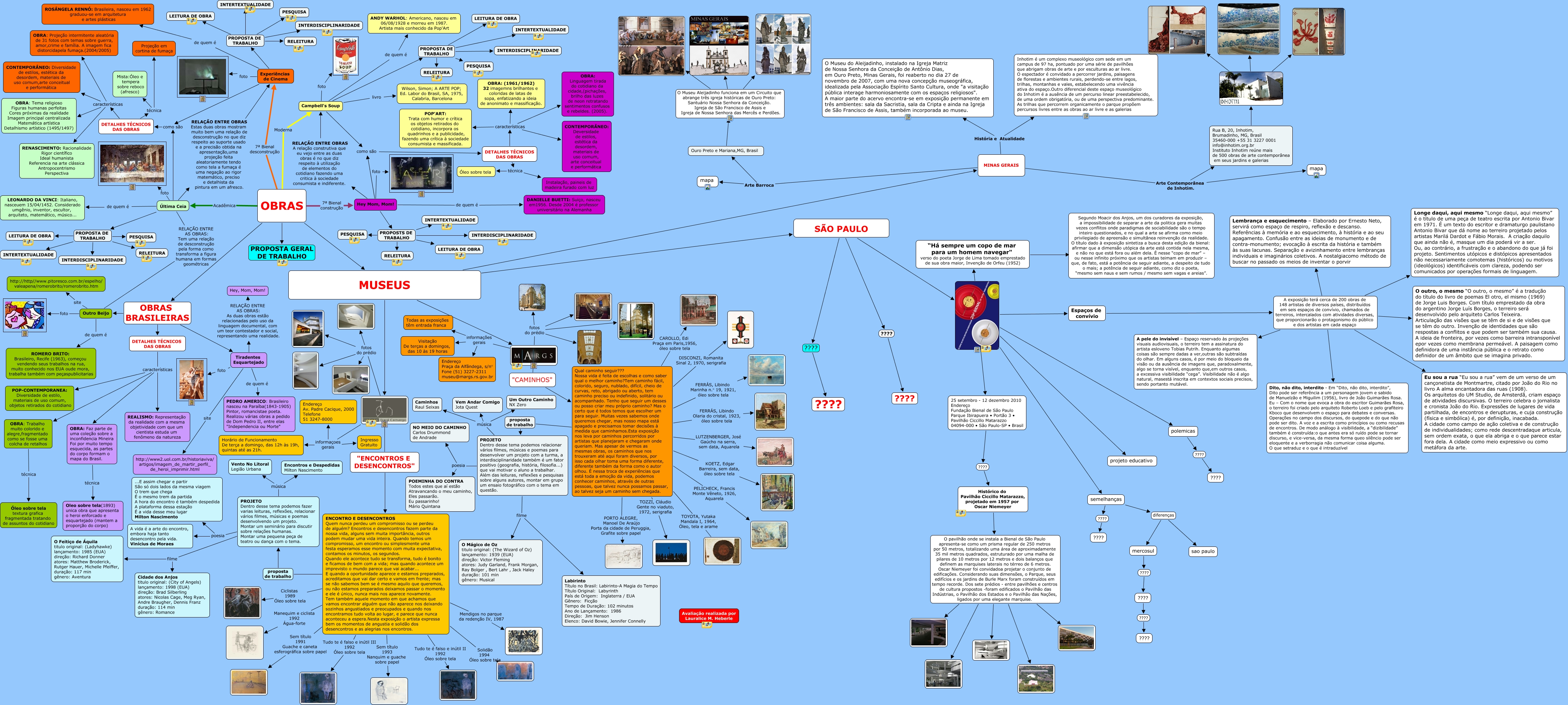Esse mapa conceitual, produzido no IHMC CmapTools, tem a informação relacionada a: MAPA PROF CURADOR OBRAS, DETALHES TÉCNICOS DAS OBRAS características RENASCIMENTO: Racionalidade Rigor científico Ideal humanista Referencia na arte clássica Antropocentrismo Perspectiva, OBRA: Faz parte de uma coleção sobre a inconfidencia Mineira Foi por muito tempo esquecida, as partes do corpo formam o mapa do Brasil. técnica Oleo sobre tela(1893) unica obra que apresenta o heroi enforcado e esquartejado (mantem a proporção do corpo), Experiências de Cinema de quem é ROSÂNGELA RENNÓ: Brasileira, nasceu em 1962 graduou-se em arquitetura e artes plásticas, Rua B, 20, Inhotim, Brumadinho, MG, Brasil 35460-000 +55 31 3227 0001 info@inhotim.org.br Instituto Inhotim reúne mais de 500 obras de arte contemporânea em seus jardins e galerias, OBRAS OBRAS BRASILEIRAS Outro Beijo, Histórico do Pavilhão Ciccillo Matarazzo, projetado em 1957 por Oscar Niemeyer O pavilhão onde se instala a Bienal de São Paulo apresenta-se como um prisma regular de 250 metros por 50 metros, totalizando uma área de aproximadamente 35 mil metros quadrados, estruturado por uma malha de pilares de 10 metros por 12 metros e dois balanços que definem as marquises laterais no térreo de 6 metros. Oscar Niemeyer foi convidadoa projetar o conjunto de edificações. Considerando suas dimensões, o Parque, seus edifícios e os jardins de Burle Marx foram construídos em tempo recorde. Dos sete prédios - entre pavilhões e centros de cultura propostos -foram edificados o Pavilhão das Indústrias, o Pavilhão dos Estados e o Pavilhão das Nações, ligados por uma elegante marquise., MINAS GERAIS História e Atualidade Inhotim é um complexo museológico com sede em um campus de 97 ha, pontuado por uma série de pavilhões que abrigam obras de arte e por esculturas ao ar livre. O espectador é convidado a percorrer jardins, paisagens de florestas e ambientes rurais, perdendo-se entre lagos, trilhas, montanhas e vales, estabelecendo uma vivência ativa do espaço.Outro diferencial deste espaço museológico do Inhotim é a ausência de um percurso linear preestabelecido, de uma ordem obrigatória, ou de uma perspectiva predominante. As trilhas que percorrem organicamente o parque propõem percursos livres entre as obras ao ar livre e as galerias, Hey Mom, Mom! foto, SÃO PAULO Espaços de convívio, Última Ceia PROPOSTA DE TRABALHO RELEITURA, Qual caminho seguir??? Nossa vida é feita de escolhas e como saber qual o melhor caminho?Tem caminho fácil, colorido, seguro, nublado, difícil, cheio de curvas, reto, abrigado ou aberto, tem caminho preciso ou indefinido, solitário ou acompanhado. Tenho que seguir um desses ou posso criar meu próprio caminho? Mas o certo que é todos temos que escolher um para seguir. Muitas vezes sabemos onde queremos chegar, mas nosso mapa está apagado e precisamos tomar decisões à medida que caminhamos.Esta exposição nos leva por caminhos percorridos por artistas que planejaram e chegaram onde queriam. Mas apesar de vermos as mesmas obras, os caminhos que nos trouxeram até aqui foram diversos, por isso cada olhar toma uma forma diferente, diferente também da forma como o autor olhou. É nessa troca de experiências que está toda a emoção da vida, podemos conhecer caminhos, através de outras pessoas, que talvez nunca possamos passar, ao talvez seja um caminho sem chegada. KOETZ, Edgar Barreira, sem data, óleo sobre tela, DETALHES TÉCNICOS DAS OBRAS técnica Instalação, paineis de madeira furado com luz, ???? ???? ????, SÃO PAULO ???? ????, Ouro Preto e Mariana,MG, Brasil O Museu Aleijadinho funciona em um Circuito que abrange três igreja históricas de Ouro Preto: Santuário Nossa Senhora da Conceição. Igreja de São Francisco de Assis e Igreja de Nossa Senhora das Mercês e Perdões., Qual caminho seguir??? Nossa vida é feita de escolhas e como saber qual o melhor caminho?Tem caminho fácil, colorido, seguro, nublado, difícil, cheio de curvas, reto, abrigado ou aberto, tem caminho preciso ou indefinido, solitário ou acompanhado. Tenho que seguir um desses ou posso criar meu próprio caminho? Mas o certo que é todos temos que escolher um para seguir. Muitas vezes sabemos onde queremos chegar, mas nosso mapa está apagado e precisamos tomar decisões à medida que caminhamos.Esta exposição nos leva por caminhos percorridos por artistas que planejaram e chegaram onde queriam. Mas apesar de vermos as mesmas obras, os caminhos que nos trouxeram até aqui foram diversos, por isso cada olhar toma uma forma diferente, diferente também da forma como o autor olhou. É nessa troca de experiências que está toda a emoção da vida, podemos conhecer caminhos, através de outras pessoas, que talvez nunca possamos passar, ao talvez seja um caminho sem chegada. PORTO ALEGRE, Manoel De Araújo Porta da cidade de Peruggia, Grafite sobre papel, fotos do prédio, OBRA: Trabalho muito colorido e alegre,fragmentado como se fosse uma colcha de retalhos técnica Óleo sobre tela textura grafica fragmentada tratando de assuntos do cotidiano, MINAS GERAIS Arte Contemporânea de Inhotim. mapa, DETALHES TÉCNICOS DAS OBRAS técnica Óleo sobre tela