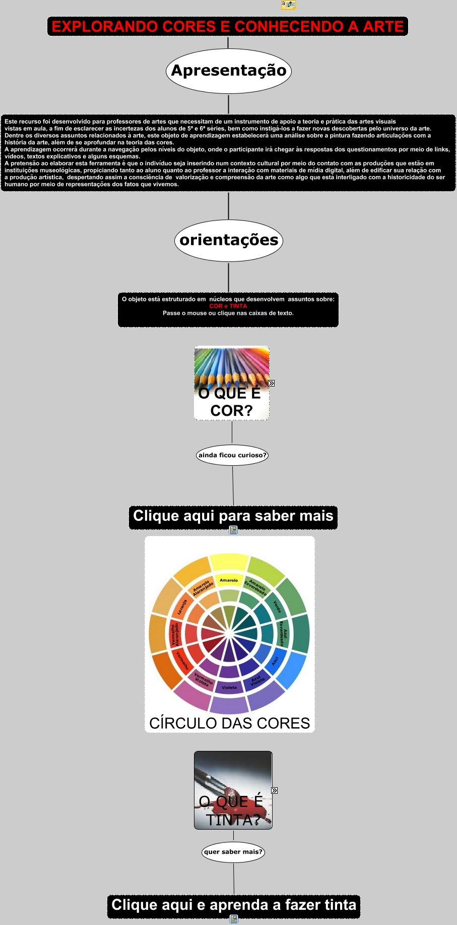 Esse mapa conceitual, produzido no IHMC CmapTools, tem a informação relacionada a: Explorando as cores e conhecendo a arte, CORES TERCI�?RIAS Definição Azul arroxeado, azul Definição CORES PRIM�?RIAS, Vermelho alaranjado Definição Azul arroxeado, Vermelho arroxeado Definição Azul arroxeado, EXPLORANDO CORES E CONHECENDO A ARTE Apresentação Este recurso foi desenvolvido para professores de artes que necessitam de um instrumento de apoio a teoria e prática das artes visuais vistas em aula, a fim de esclarecer as incertezas dos alunos de 5ª e 6ª séries, bem como instigá-los a fazer novas descobertas pelo universo da arte. Dentre os diversos assuntos relacionados à arte, este objeto de aprendizagem estabelecerá uma análise sobre a pintura fazendo articulações com a história da arte, além de se aprofundar na teoria das cores. A aprendizagem ocorrerá durante a navegação pelos níveis do objeto, onde o participante irá chegar às respostas dos questionamentos por meio de links, vídeos, textos explicativos e alguns esquemas. A pretensão ao elaborar esta ferramenta é que o indivíduo seja inserindo num contexto cultural por meio do contato com as produções que estão em instituições museológicas, propiciando tanto ao aluno quanto ao professor a interação com materiais de mídia digital, além de edificar sua relação com a produção artística, despertando assim a consciência de valorização e compreensão da arte como algo que está interligado com a historicidade do ser humano por meio de representações dos fatos que vivemos., vermelho Definição CORES PRIM�?RIAS, CLIQUE AQUI Definição Azul arroxeado, Azul esverdeado Definição Azul arroxeado, Amarelo alaranjado Definição Azul arroxeado, Roxo Definição Verde, Este recurso foi desenvolvido para professores de artes que necessitam de um instrumento de apoio a teoria e prática das artes visuais vistas em aula, a fim de esclarecer as incertezas dos alunos de 5ª e 6ª séries, bem como instigá-los a fazer novas descobertas pelo universo da arte. Dentre os diversos assuntos relacionados à arte, este objeto de aprendizagem estabelecerá uma análise sobre a pintura fazendo articulações com a história da arte, além de se aprofundar na teoria das cores. A aprendizagem ocorrerá durante a navegação pelos níveis do objeto, onde o participante irá chegar às respostas dos questionamentos por meio de links, vídeos, textos explicativos e alguns esquemas. A pretensão ao elaborar esta ferramenta é que o indivíduo seja inserindo num contexto cultural por meio do contato com as produções que estão em instituições museológicas, propiciando tanto ao aluno quanto ao professor a interação com materiais de mídia digital, além de edificar sua relação com a produção artística, despertando assim a consciência de valorização e compreensão da arte como algo que está interligado com a historicidade do ser humano por meio de representações dos fatos que vivemos. orientações O objeto está estruturado em núcleos que desenvolvem assuntos sobre: COR e TINTA Passe o mouse ou clique nas caixas de texto., CORES SECUND�?RIAS Definição Verde, CORES SECUND�?RIAS Tipos Cor-pigmento, Cor-luz Tipos Cor-pigmento, Laranja Definição Verde, CORES TERCI�?RIAS Tipos CORES PRIM�?RIAS, Cor-luz Tipos CORES PRIM�?RIAS, Clique aqui para saber mais ainda ficou curioso? O QUE É COR?, Clique aqui e aprenda a fazer tinta quer saber mais? O QUE É TINTA?, CORES SECUND�?RIAS Tipos CORES PRIM�?RIAS