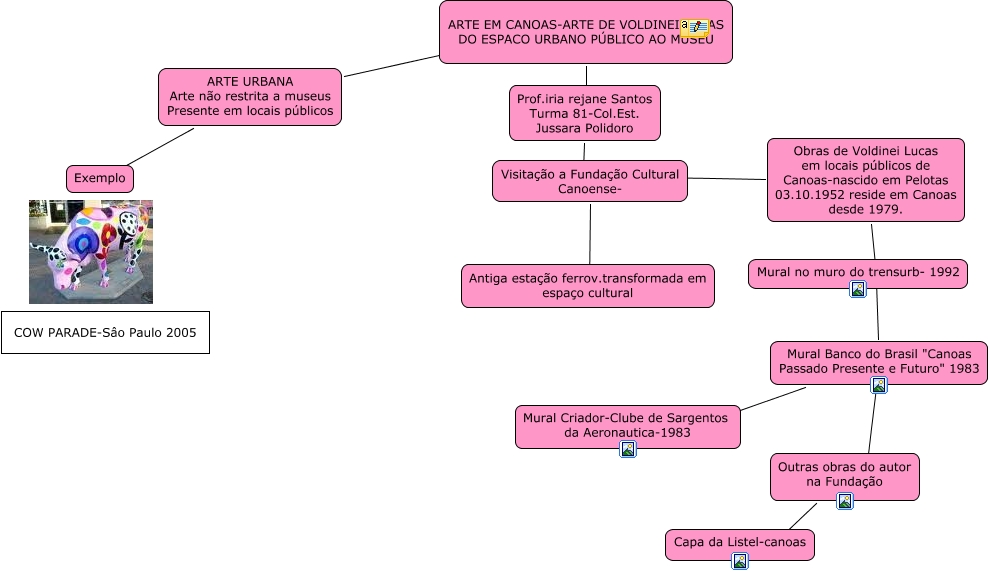 Esse mapa conceitual, produzido no IHMC CmapTools, tem a informação relacionada a: Arte Urbana em Canoas, Outras obras do autor na Fundação ???? Capa da Listel-canoas, Mural Banco do Brasil "Canoas Passado Presente e Futuro" 1983 ???? Outras obras do autor na Fundação, ARTE URBANA Arte não restrita a museus Presente em locais públicos ???? ARTE EM CANOAS-ARTE DE VOLDINEI LUCAS DO ESPACO URBANO PÚBLICO AO MUSEU, Prof.iria rejane Santos Turma 81-Col.Est. Jussara Polidoro ???? Visitação a Fundação Cultural Canoense-, Obras de Voldinei Lucas em locais públicos de Canoas-nascido em Pelotas 03.10.1952 reside em Canoas desde 1979. ???? Visitação a Fundação Cultural Canoense-, ARTE EM CANOAS-ARTE DE VOLDINEI LUCAS DO ESPACO URBANO PÚBLICO AO MUSEU ???? Prof.iria rejane Santos Turma 81-Col.Est. Jussara Polidoro, Mural Banco do Brasil "Canoas Passado Presente e Futuro" 1983 ???? Mural Criador-Clube de Sargentos da Aeronautica-1983, Obras de Voldinei Lucas em locais públicos de Canoas-nascido em Pelotas 03.10.1952 reside em Canoas desde 1979. ???? Mural Banco do Brasil "Canoas Passado Presente e Futuro" 1983, ARTE URBANA Arte não restrita a museus Presente em locais públicos ???? Exemplo, Visitação a Fundação Cultural Canoense- ???? Antiga estação ferrov.transformada em espaço cultural, Mural Banco do Brasil "Canoas Passado Presente e Futuro" 1983 ???? Outras obras do autor na Fundação