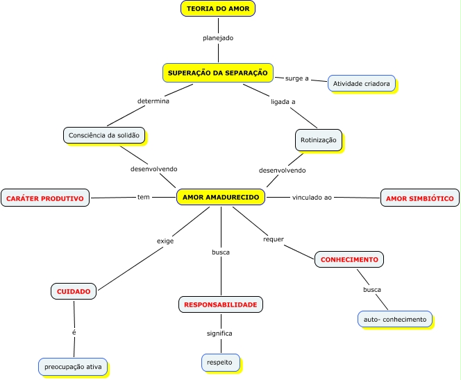 Esse mapa conceitual, produzido no IHMC CmapTools, tem a informação relacionada a: Curriculo - Artes Visuais, SUPERAÇÃO DA SEPARAÇÃO ligada a Rotinização, AMOR AMADURECIDO busca RESPONSABILIDADE, AMOR AMADURECIDO exige CUIDADO, CARÁTER PRODUTIVO tem AMOR AMADURECIDO, Rotinização desenvolvendo AMOR AMADURECIDO, AMOR AMADURECIDO requer CONHECIMENTO, RESPONSABILIDADE significa respeito, CONHECIMENTO busca auto- conhecimento, SUPERAÇÃO DA SEPARAÇÃO surge a Atividade criadora, AMOR SIMBIÓTICO vinculado ao AMOR AMADURECIDO, TEORIA DO AMOR planejado SUPERAÇÃO DA SEPARAÇÃO, SUPERAÇÃO DA SEPARAÇÃO determina Consciência da solidão, Consciência da solidão desenvolvendo AMOR AMADURECIDO, CUIDADO é preocupação ativa