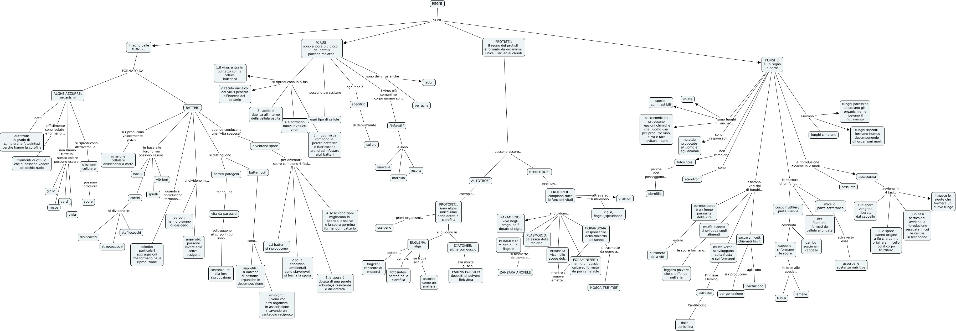 Questa Cmap, creata con IHMC CmapTools, contiene informazioni relative a: TUTTE LE MAPPE UNITE DEL CAPITOLO MONERE VIRUS FUNGHI E PROPTISTI VIRGY, VIRUS: sono ancora più piccoli dei batteri portano malattie si riproducono in 5 fasi 1.il virus entra in contatto con la cellula batterica, TRIPANSOMA: responsabile della malattia del sonno si trasmette da uomo a... MOSCA TSE'-TSE', vita da parassiti sottraggono al corpo in cui sono.. sostanze utili alla loro riproduzione, specifico di determinate cellule, cocchi si dividono in... streptococchi, PROTOFITI: sono alghe unicellulari sono dotati di clorofilla si divdono in.. EUGLENA: alga, FUNGHI: è un regno a parte sono eterotrofi, FUNGHI: è un regno a parte sono funghi anche... specie commestibili, ALGHE AZZURRE: organismi difficilmente sono isolate e formano... filamenti di cellule che si possono vedere ad occhio nudo, FUNGHI: è un regno a parte esistono vari tipi di funghi... muffa bianca: si sviluppa sugli alimenti, FUNGHI: è un regno a parte sono funghi anche... muffe, "infantili" e sono varicella, PROTOZOI: compiono tutte le funzioni vitali si dividono.. AMBEMA: vice nelle acque dolci, VIRUS: sono ancora più piccoli dei batteri portano malattie si riproducono in 5 fasi 2.l'acido nucleico del virus penetra all'interno del batterio, BATTERI in base alle loro forme possono essere.. bacilli, BATTERI si distinguono batteri patogeni, BATTERI si dividono in... aerobi: hanno bisogno di ossigeno, EUGLENA: alga se trova acqua.. assorbe come un aminale, FUNGHI: è un regno a parte esistono vari tipi di funghi... muffa verde: si sviluppano sulla frutta e sui formaggi, diventano spore per diventare spore compiono 4 fasi... 4.se le condizioni migliorano la spora si dissolve e la spora germina formando il batterio