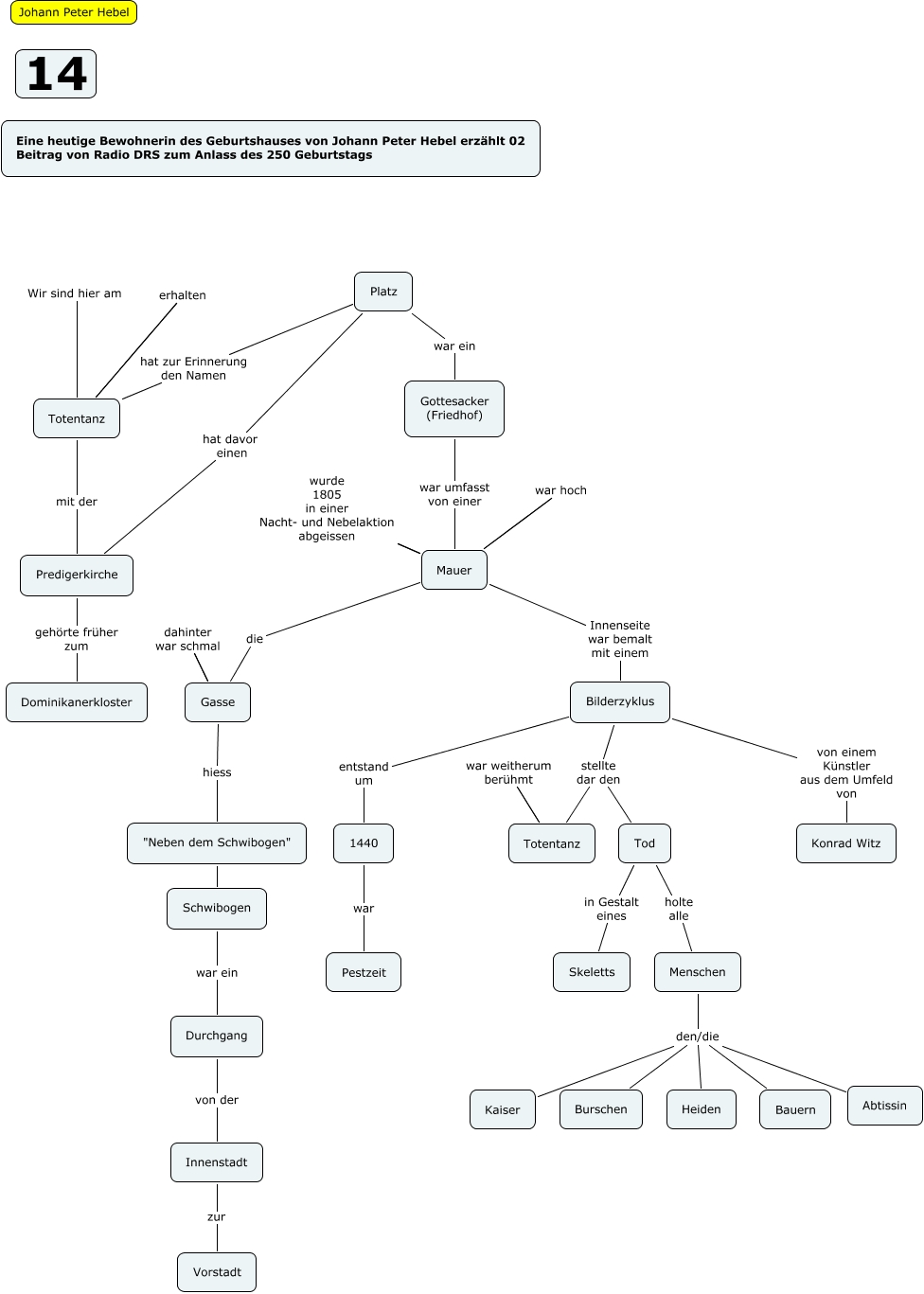 Dieses mit IHMC CmapTools erstellte CMap hat Informationen bezüglich: 14 Johann Peter Hebel Eine Bewohnerin des Geburtshauses erzählt 02, Totentanz mit der Predigerkirche, Platz war ein Gottesacker (Friedhof), Gottesacker (Friedhof) war umfasst von einer Mauer, Bilderzyklus entstand um 1440, 1440 war Pestzeit, Bilderzyklus stellte dar den Totentanz, Menschen den/die Abtissin, Gasse hiess "Neben dem Schwibogen", Innenstadt zur Vorstadt, Platz hat zur Erinnerung den Namen Totentanz, Predigerkirche gehörte früher zum Dominikanerkloster, Predigerkirche hat davor einen Platz, Bilderzyklus von einem Künstler aus dem Umfeld von Konrad Witz, Tod in Gestalt eines Skeletts, Menschen den/die Burschen, Menschen den/die Bauern, Mauer die Gasse, "Neben dem Schwibogen" Schwibogen, Schwibogen war ein Durchgang, Durchgang von der Innenstadt