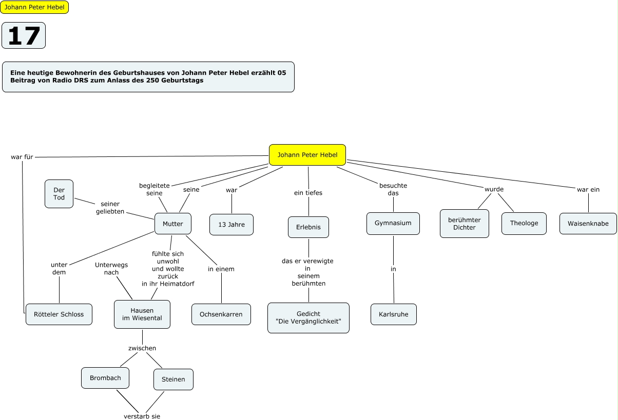 Dieses mit IHMC CmapTools erstellte CMap hat Informationen bezüglich: 17 Johann Peter Hebel Eine Bewohnerin des Geburtshauses erzählt 05, Erlebnis das er verewigte in seinem berühmten Gedicht "Die Vergänglichkeit", Rötteler Schloss war für Johann Peter Hebel, Johann Peter Hebel wurde Theologe, Gymnasium in Karlsruhe, Johann Peter Hebel besuchte das Gymnasium, Brombach verstarb sie Steinen, Hausen im Wiesental zwischen Steinen, Mutter in einem Ochsenkarren, Mutter fühlte sich unwohl und wollte zurück in ihr Heimatdorf Hausen im Wiesental, Johann Peter Hebel seine Mutter, Johann Peter Hebel war 13 Jahre, Johann Peter Hebel ein tiefes Erlebnis, Mutter unter dem Rötteler Schloss, Der Tod seiner geliebten Mutter, Johann Peter Hebel wurde berühmter Dichter, Johann Peter Hebel war ein Waisenknabe, Hausen im Wiesental zwischen Brombach, Johann Peter Hebel begleitete seine Mutter