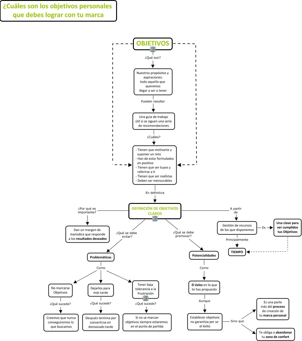 Este Cmap, tiene información relacionada con: Cuáles son los objetivos personales que debes lograr con tu marca, No marcarse Objetivos ¿Qué sucede? Creemos que nunca conseguiremos lo que buscamos, - Tienen que motivarte y suponer un reto - Han de estar formulados en positivo - Tienen que ser tuyos y referirse a ti - Tienen que ser realistas - Deben ser mensurables En definitiva DEFINICIÓN DE OBJETIVOS CLAROS, OBJETIVOS . - Tienen que motivarte y suponer un reto - Han de estar formulados en positivo - Tienen que ser tuyos y referirse a ti - Tienen que ser realistas - Deben ser mensurables, DEFINICIÓN DE OBJETIVOS CLAROS ¿Qué se debe evitar? Problemáticas, Establecer objetivos no garantiza per se el éxito Sino que Te obliga a abandonar tu zona de confort, OBJETIVOS ¿Qué son? Nuestros propósitos y aspiraciones: todo aquello que queremos llegar a ser o tener, OBJETIVOS . - Tienen que motivarte y suponer un reto - Han de estar formulados en positivo - Tienen que ser tuyos y referirse a ti - Tienen que ser realistas - Deben ser mensurables, Una guía de trabajo útil si se siguen una serie de recomendaciones ¿Cuáles? - Tienen que motivarte y suponer un reto - Han de estar formulados en positivo - Tienen que ser tuyos y referirse a ti - Tienen que ser realistas - Deben ser mensurables, Dejarlos para más tarde ¿Qué sucede? Después termina por convertirse en demasiado tarde, Potencialidades Como El éxito en lo que te has propuesto, Gestión de recursos de los que disponemos Es Una clave para ver cumplidos tus Objetivos, DEFINICIÓN DE OBJETIVOS CLAROS A partir de Gestión de recursos de los que disponemos, Problemáticas Como No marcarse Objetivos, DEFINICIÓN DE OBJETIVOS CLAROS ¿Por qué es importante? Dan un margen de maniobra que responde a los resultados deseados, DEFINICIÓN DE OBJETIVOS CLAROS ¿Qué se debe promover? Potencialidades, Una clave para ver cumplidos tus Objetivos . TIEMPO, El éxito en lo que te has propuesto Aunque Establecer objetivos no garantiza per se el éxito, Problemáticas Como Tener baja tolerancia a la frustración, Gestión de recursos de los que disponemos Principalmente TIEMPO, Problemáticas Como Dejarlos para más tarde