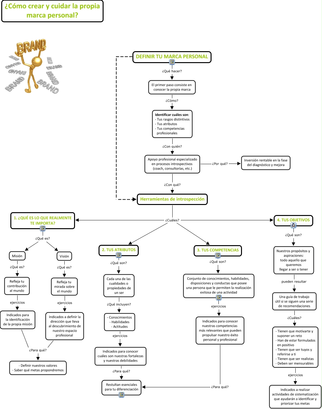 Este Cmap, tiene información relacionada con: Cómo crear y cuidar la propia marca personal, El primer paso consiste en conocer la propia marca ¿Cómo? Identificar cuáles son: - Tus rasgos distintivos - Tus atributos - Tus competencias profesionales, DEFINIR TU MARCA PERSONAL . Herramientas de introspección, Herramientas de introspección ¿Cuáles? 3. TUS COMPETENCIAS, Herramientas de introspección ¿Cuáles? 4. TUS OBJETIVOS, Una guía de trabajo útil si se siguen una serie de recomendaciones ¿Cuáles? - Tienen que motivarte y suponer un reto - Han de estar formulados en positivo - Tienen que ser tuyos y referirse a ti - Tienen que ser realistas - Deben ser mensurables, Cada una de las cualidades o propiedades de un ser ¿Qué incluyen? - Conocimientos - Habilidades - Actitudes, Visión ¿Qué es? Refleja tu mirada sobre el mundo, - Tienen que motivarte y suponer un reto - Han de estar formulados en positivo - Tienen que ser tuyos y referirse a ti - Tienen que ser realistas - Deben ser mensurables ejercicios Indicados a realizar actividades de sistematización que ayudarán a identificar y priorizar tus metas, Herramientas de introspección ¿Cuáles? 2. TUS ATRIBUTOS, Herramientas de introspección ¿Cuáles? 1. ¿QUÉ ES LO QUE REALMENTE TE IMPORTA?, Indicados a definir la dirección que lleva al descubrimiento de nuestro espacio profesional ¿Para qué? - Definir nuestros valores - Saber qué metas propondremos, Misión ¿Qué es? Refleja tu contribución al mundo, Indicados para conocer nuestras competencias más relevantes que pueden propulsar nuestro éxito personal y profesional ¿Para qué? Restultan esenciales para tu diferenciación, Refleja tu mirada sobre el mundo ejercicios Indicados a definir la dirección que lleva al descubrimiento de nuestro espacio profesional, - Conocimientos - Habilidades - Actitudes ejercicios Indicados para conocer cuáles son nuestras fortalezas y nuestras debilidades, 3. TUS COMPETENCIAS ¿Qué son? Conjunto de conocimientos, habilidades, disposiciones y conductas que posee una persona que le permiten la realización exitosa de una actividad, Apoyo profesional especializado en procesos introspectivos (coach, consultorías, etc.) ¿Con qué? Herramientas de introspección, Conjunto de conocimientos, habilidades, disposiciones y conductas que posee una persona que le permiten la realización exitosa de una actividad ejercicios Indicados para conocer nuestras competencias más relevantes que pueden propulsar nuestro éxito personal y profesional, Identificar cuáles son: - Tus rasgos distintivos - Tus atributos - Tus competencias profesionales ¿Con quién? Apoyo profesional especializado en procesos introspectivos (coach, consultorías, etc.), Indicados para la identificación de la propia misión ¿Para qué? - Definir nuestros valores - Saber qué metas propondremos