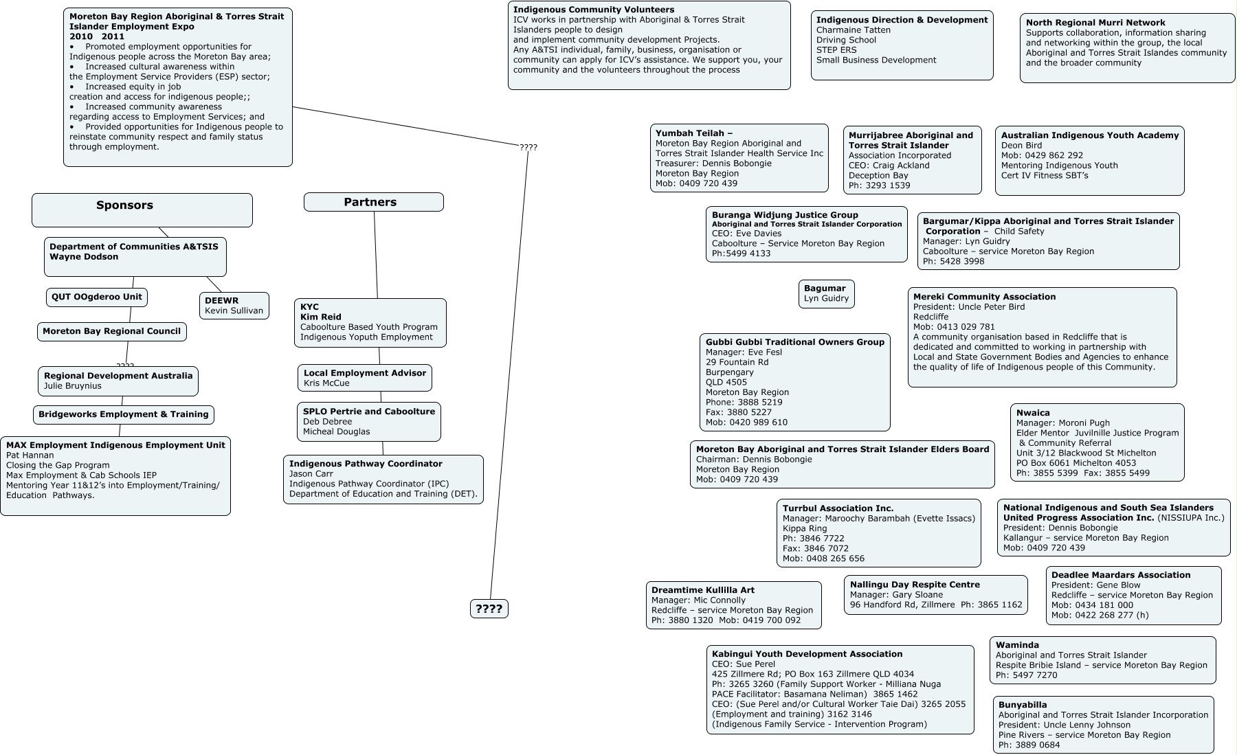 Este Cmap, tiene información relacionada con: Moreton Bay Region A&TSI, Department of Communities A&TSIS Wayne Dodson ???? MAX Employment Indigenous Employment Unit Pat Hannan Closing the Gap Program Max Employment & Cab Schools IEP Mentoring Year 11&12’s into Employment/Training/ Education Pathways., Partners ???? Indigenous Pathway Coordinator Jason Carr Indigenous Pathway Coordinator (IPC) Department of Education and Training (DET)., Moreton Bay Region Aboriginal & Torres Strait Islander Employment Expo 2010 2011 • Promoted employment opportunities for Indigenous people across the Moreton Bay area; • Increased cultural awareness within the Employment Service Providers (ESP) sector; • Increased equity in job creation and access for indigenous people;; • Increased community awareness regarding access to Employment Services; and • Provided opportunities for Indigenous people to reinstate community respect and family status through employment. ???? ????, Sponsors ???? DEEWR Kevin Sullivan