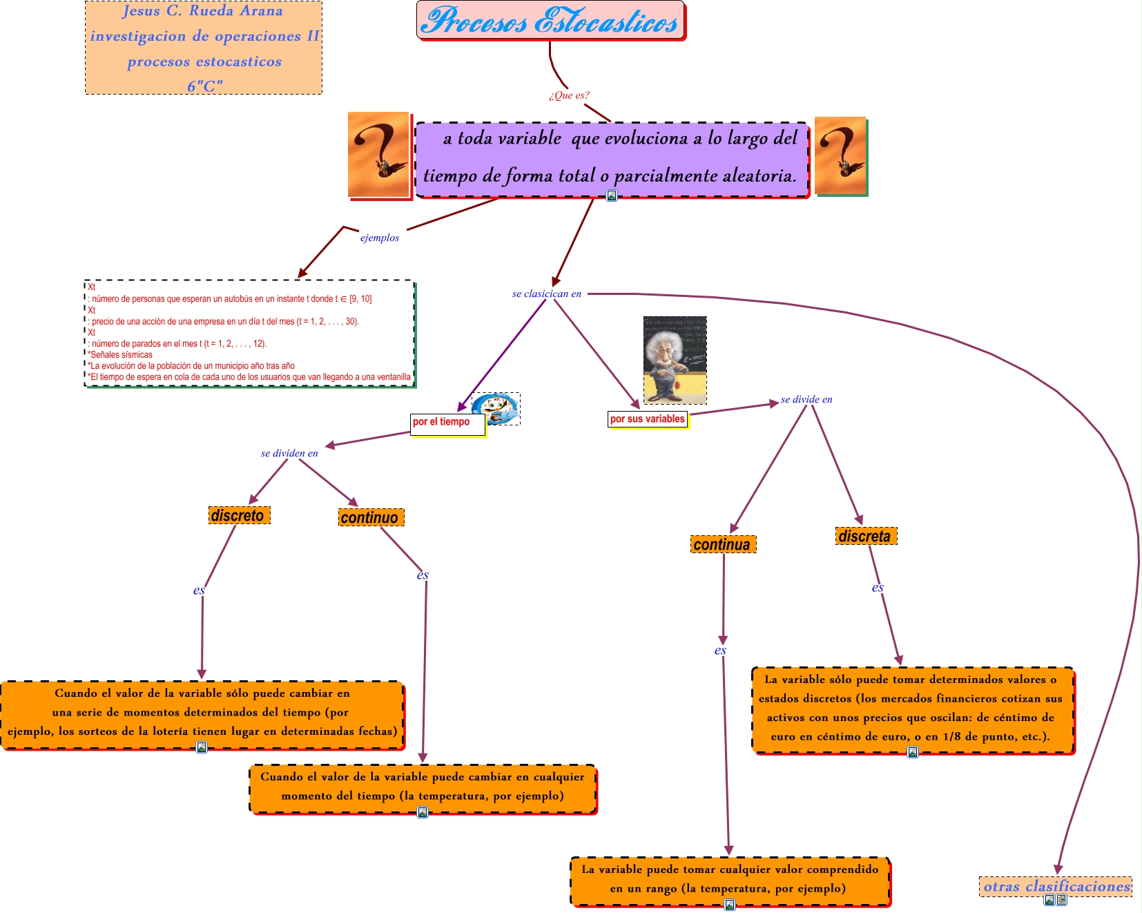 Este Cmap, tiene información relacionada con: Procesos EStocasticos, continua es La variable puede tomar cualquier valor comprendido en un rango (la temperatura, por ejemplo), continuo es Cuando el valor de la variable puede cambiar en cualquier momento del tiempo (la temperatura, por ejemplo), a toda variable que evoluciona a lo largo del tiempo de forma total o parcialmente aleatoria. se clasicican en otras clasificaciones, por sus variables se divide en discreta, a toda variable que evoluciona a lo largo del tiempo de forma total o parcialmente aleatoria. se clasicican en por sus variables, discreta es La variable sólo puede tomar determinados valores o estados discretos (los mercados financieros cotizan sus activos con unos precios que oscilan: de céntimo de euro en céntimo de euro, o en 1/8 de punto, etc.)., a toda variable que evoluciona a lo largo del tiempo de forma total o parcialmente aleatoria. se clasicican en por el tiempo, por el tiempo se dividen en continuo, por el tiempo se dividen en discreto, por sus variables se divide en continua, discreto es Cuando el valor de la variable sólo puede cambiar en una serie de momentos determinados del tiempo (por ejemplo, los sorteos de la lotería tienen lugar en determinadas fechas), Procesos Estocasticos ¿Que es? a toda variable que evoluciona a lo largo del tiempo de forma total o parcialmente aleatoria., a toda variable que evoluciona a lo largo del tiempo de forma total o parcialmente aleatoria. ejemplos Xt : número de personas que esperan un autobús en un instante t donde t ∈ [9, 10] Xt : precio de una acción de una empresa en un día t del mes (t = 1, 2, . . . , 30). Xt : número de parados en el mes t (t = 1, 2, . . . , 12). *Señales sísmicas *La evolución de la población de un municipio año tras año *El tiempo de espera en cola de cada uno de los usuarios que van llegando a una ventanilla