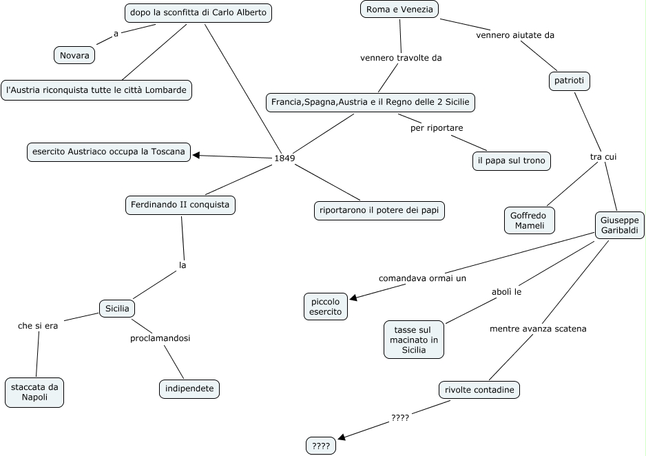 Questa Cmap, creata con IHMC CmapTools, contiene informazioni relative a: Garibaldi (Carlotta, Alessia, Susan), Sicilia che si era staccata da Napoli, Roma e Venezia vennero travolte da Francia,Spagna,Austria e il Regno delle 2 Sicilie, dopo la sconfitta di Carlo Alberto 1849 riportarono il potere dei papi, rivolte contadine ???? ????, dopo la sconfitta di Carlo Alberto ???? l'Austria riconquista tutte le città Lombarde, dopo la sconfitta di Carlo Alberto 1849 esercito Austriaco occupa la Toscana, Francia,Spagna,Austria e il Regno delle 2 Sicilie 1849 riportarono il potere dei papi, patrioti tra cui Giuseppe Garibaldi, dopo la sconfitta di Carlo Alberto 1849 Ferdinando II conquista, Sicilia proclamandosi indipendete, Ferdinando II conquista la Sicilia, Giuseppe Garibaldi mentre avanza scatena rivolte contadine, Roma e Venezia vennero aiutate da patrioti, Francia,Spagna,Austria e il Regno delle 2 Sicilie 1849 esercito Austriaco occupa la Toscana, dopo la sconfitta di Carlo Alberto a Novara, Francia,Spagna,Austria e il Regno delle 2 Sicilie per riportare il papa sul trono, Giuseppe Garibaldi comandava ormai un piccolo esercito, Giuseppe Garibaldi abolì le tasse sul macinato in Sicilia, patrioti tra cui Goffredo Mameli, Francia,Spagna,Austria e il Regno delle 2 Sicilie 1849 Ferdinando II conquista