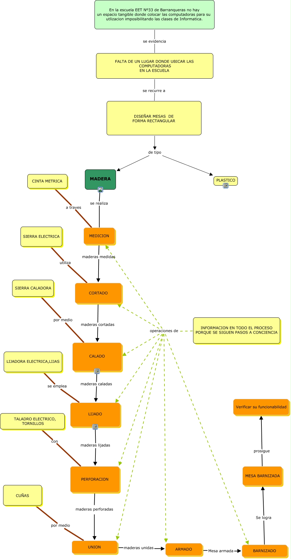 Este Cmap, tiene información relacionada con: proyecto 5 pared daniel, En la escuela EET Nº33 de Barranqueras no hay un espacio tangible donde colocar las computadoras para su utlizacion imposibilitando las clases de Informatica. se evidencia FALTA DE UN LUGAR DONDE UBICAR LAS COMPUTADORAS EN LA ESCUELA, PERFORACION con TALADRO ELECTRICO, TORNILLOS, INFORMACION EN TODO EL PROCESO PORQUE SE SIGUEN PASOS A CONCIENCIA operaciones de PERFORACION, DISEÑAR MESAS DE FORMA RECTANGULAR de tipo MADERA, PERFORACION maderas perforadas UNION, INFORMACION EN TODO EL PROCESO PORQUE SE SIGUEN PASOS A CONCIENCIA operaciones de MEDICION, CORTADO utiliza SIERRA ELECTRICA, CORTADO maderas cortadas CALADO, INFORMACION EN TODO EL PROCESO PORQUE SE SIGUEN PASOS A CONCIENCIA operaciones de ????, INFORMACION EN TODO EL PROCESO PORQUE SE SIGUEN PASOS A CONCIENCIA operaciones de UNION, INFORMACION EN TODO EL PROCESO PORQUE SE SIGUEN PASOS A CONCIENCIA operaciones de CALADO, ARMADO Mesa armada BARNIZADO, INFORMACION EN TODO EL PROCESO PORQUE SE SIGUEN PASOS A CONCIENCIA operaciones de ARMADO, INFORMACION EN TODO EL PROCESO PORQUE SE SIGUEN PASOS A CONCIENCIA operaciones de ????, MEDICION a traves CINTA METRICA, UNION por medio CUÑAS, DISEÑAR MESAS DE FORMA RECTANGULAR de tipo PLASTICO, UNION maderas unidas ARMADO, CALADO por medio SIERRA CALADORA, LIJADO maderas lijadas PERFORACION