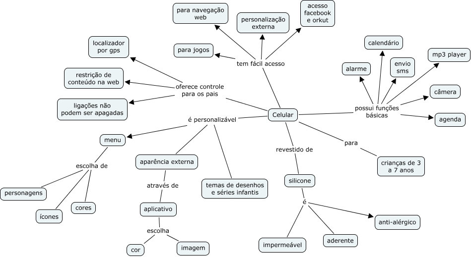 Esse mapa conceitual, produzido no IHMC CmapTools, tem a informação relacionada a: celular, Celular oferece controle para os pais ligações não podem ser apagadas, Celular revestido de silicone, silicone é aderente, Celular é personalizável menu, menu escolha de personagens, menu escolha de ícones, Celular possui funções básicas câmera, aparência externa através de aplicativo, Celular possui funções básicas agenda, silicone é anti-alérgico, Celular oferece controle para os pais localizador por gps, Celular é personalizável aparência externa, Celular é personalizável temas de desenhos e séries infantis, Celular possui funções básicas envio sms, Celular possui funções básicas alarme, Celular possui funções básicas mp3 player, aplicativo escolha cor, Celular tem fácil acesso acesso facebook e orkut, Celular possui funções básicas calendário, silicone é impermeável