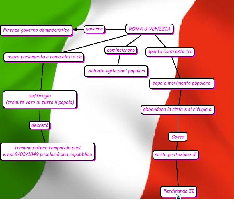 Questa Cmap, creata con IHMC CmapTools, contiene informazioni relative a: I democratici e le repubbliche di Venezia e Roma.II D Sara, ROMA & VENEZIA cominciarono violente agitazioni popolari, suffiragio (tramite voto di tutto il popolo) decretò termine potere temporale papi e nel 9/02/1849 proclamò una repubblica, ROMA & VENEZIA nuovo parlamento a roma eletto da suffiragio (tramite voto di tutto il popolo), ROMA & VENEZIA governo Firenze governo demmocratico, ROMA & VENEZIA aperto contrasto tra papa e movimento popolare, papa e movimento popolare abbandona la città e si rifugia a Gaeta, Gaeta sotto protezione di Ferdinando II