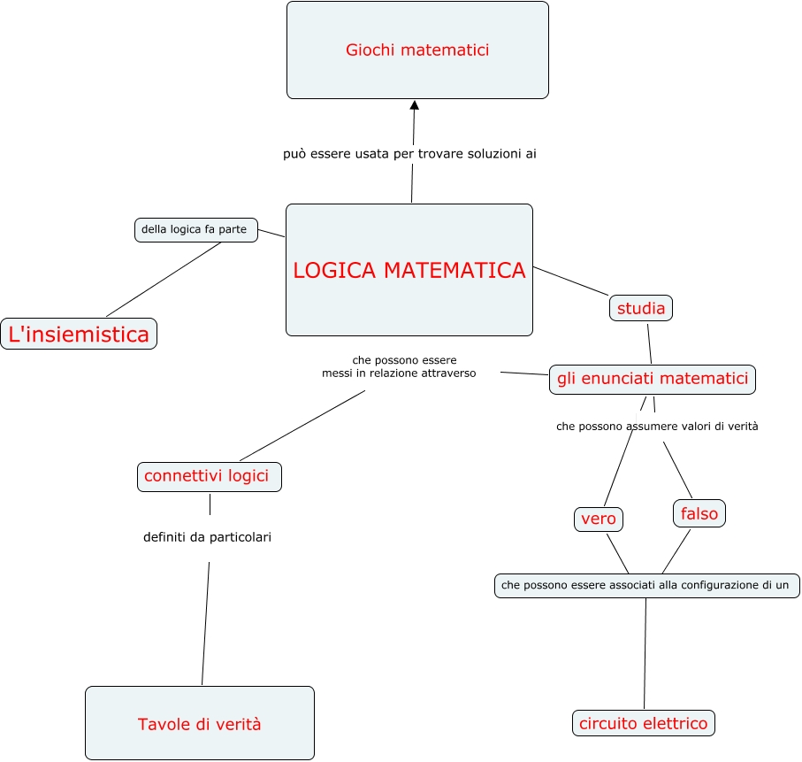 Questa Cmap, creata con IHMC CmapTools, contiene informazioni relative a: mappa concettuale, LOGICA MATEMATICA L'insiemistica, LOGICA MATEMATICA ???? studia, studia ???? gli enunciati matematici, LOGICA MATEMATICA può essere usata per trovare soluzioni ai Giochi matematici, connettivi logici definiti da particolari Tavole di verità, vero ???? che possono essere associati alla configurazione di un, che possono essere associati alla configurazione di un ???? circuito elettrico, gli enunciati matematici che possono assumere valori di verità falso, gli enunciati matematici che possono essere messi in relazione attraverso connettivi logici, falso ???? che possono essere associati alla configurazione di un, gli enunciati matematici vero