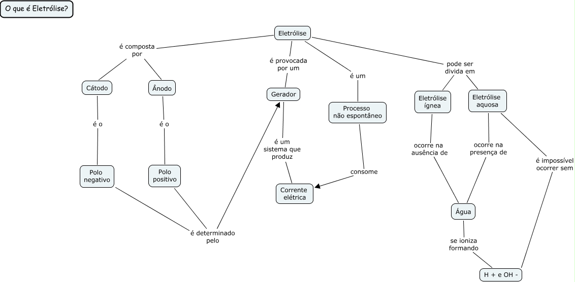 Esse mapa conceitual, produzido no IHMC CmapTools, tem a informação relacionada a: O que é Eletrólise 2D, Processo não espontâneo consome Corrente elétrica, Ânodo é o Polo positivo, Polo negativo é determinado pelo Gerador, Eletrólise é provocada por um Gerador, Eletrólise é um Processo não espontâneo, Gerador é um sistema que produz Corrente elétrica, Eletrólise ígnea ocorre na ausência de Água, Eletrólise pode ser divida em Eletrólise ígnea, Eletrólise é composta por Cátodo, Água se ioniza formando H + e OH -, Eletrólise é composta por Ânodo, Polo positivo é determinado pelo Gerador, Cátodo é o Polo negativo, Eletrólise aquosa é impossível ocorrer sem H + e OH -, Eletrólise pode ser divida em Eletrólise aquosa, Eletrólise aquosa ocorre na presença de Água