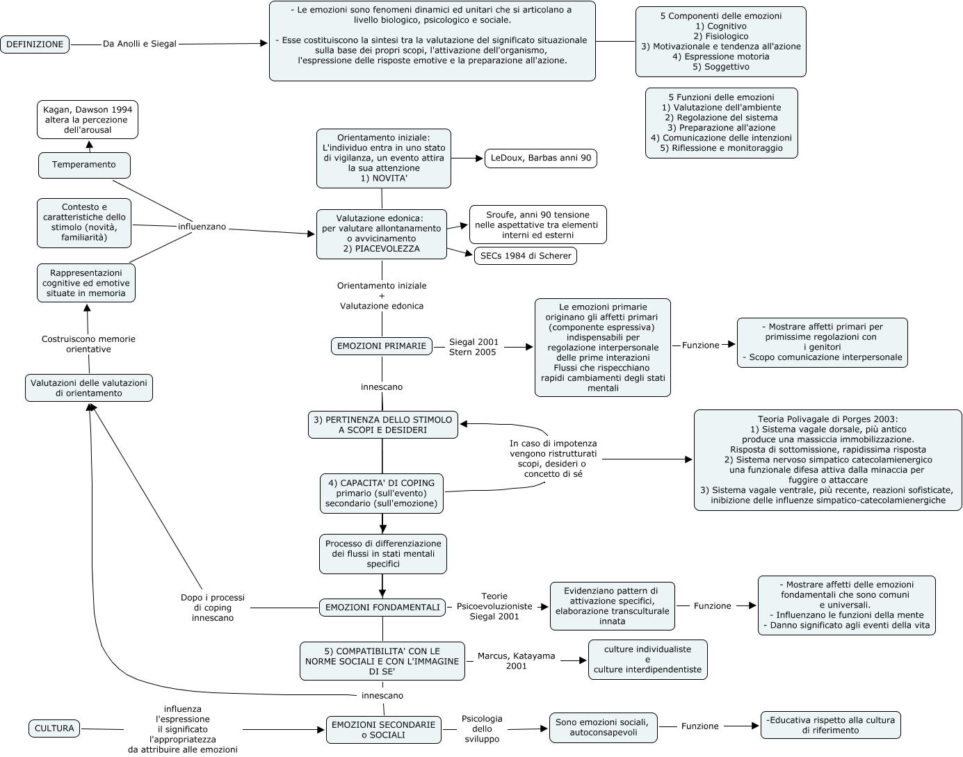 Questa Cmap, creata con IHMC CmapTools, contiene informazioni relative a: 6.1.1. Funzionamento emozioni, CULTURA influenza l'espressione il significato l'appropriatezza da attribuire alle emozioni EMOZIONI SECONDARIE o SOCIALI, EMOZIONI PRIMARIE innescano 3) PERTINENZA DELLO STIMOLO A SCOPI E DESIDERI, 5) COMPATIBILITA' CON LE NORME SOCIALI E CON L'IMMAGINE DI SE' innescano EMOZIONI SECONDARIE o SOCIALI, Valutazione edonica: per valutare allontanamento o avvicinamento 2) PIACEVOLEZZA ???? SECs 1984 di Scherer, EMOZIONI FONDAMENTALI Teorie Psicoevoluzioniste Siegal 2001 Evidenziano pattern di attivazione specifici, elaborazione transculturale innata, Sono emozioni sociali, autoconsapevoli Funzione -Educativa rispetto alla cultura di riferimento, DEFINIZIONE Da Anolli e Siegal - Le emozioni sono fenomeni dinamici ed unitari che si articolano a livello biologico, psicologico e sociale. - Esse costituiscono la sintesi tra la valutazione del significato situazionale sulla base dei propri scopi, l'attivazione dell'organismo, l'espressione delle risposte emotive e la preparazione all'azione., Valutazione edonica: per valutare allontanamento o avvicinamento 2) PIACEVOLEZZA Orientamento iniziale + Valutazione edonica EMOZIONI PRIMARIE, Le emozioni primarie originano gli affetti primari (componente espressiva) indispensabili per regolazione interpersonale delle prime interazioni Flussi che rispecchiano rapidi cambiamenti degli stati mentali Funzione - Mostrare affetti primari per primissime regolazioni con i genitori - Scopo comunicazione interpersonale, EMOZIONI FONDAMENTALI Dopo i processi di coping innescano Valutazioni delle valutazioni di orientamento, EMOZIONI SECONDARIE o SOCIALI Psicologia dello sviluppo Sono emozioni sociali, autoconsapevoli, Orientamento iniziale: L'individuo entra in uno stato di vigilanza, un evento attira la sua attenzione 1) NOVITA' LeDoux, Barbas anni 90, 4) CAPACITA' DI COPING primario (sull'evento) secondario (sull'emozione) In caso di impotenza vengono ristrutturati scopi, desideri o concetto di sé Teoria Polivagale di Porges 2003: 1) Sistema vagale dorsale, più antico produce una massiccia immobilizzazione. Risposta di sottomissione, rapidissima risposta 2) Sistema nervoso simpatico catecolamienergico una funzionale difesa attiva dalla minaccia per fuggire o attaccare 3) Sistema vagale ventrale, più recente, reazioni sofisticate, inibizione delle influenze simpatico-catecolamienergiche, 5) COMPATIBILITA' CON LE NORME SOCIALI E CON L'IMMAGINE DI SE' innescano Valutazioni delle valutazioni di orientamento, Temperamento ???? Kagan, Dawson 1994 altera la percezione dell'arousal, Temperamento influenzano Valutazione edonica: per valutare allontanamento o avvicinamento 2) PIACEVOLEZZA, Orientamento iniziale: L'individuo entra in uno stato di vigilanza, un evento attira la sua attenzione 1) NOVITA' ???? Valutazione edonica: per valutare allontanamento o avvicinamento 2) PIACEVOLEZZA, Evidenziano pattern di attivazione specifici, elaborazione transculturale innata Funzione - Mostrare affetti delle emozioni fondamentali che sono comuni e universali. - Influenzano le funzioni della mente - Danno significato agli eventi della vita, Valutazione edonica: per valutare allontanamento o avvicinamento 2) PIACEVOLEZZA ???? Sroufe, anni 90 tensione nelle aspettative tra elementi interni ed esterni, Contesto e caratteristiche dello stimolo (novità, familiarità) influenzano Valutazione edonica: per valutare allontanamento o avvicinamento 2) PIACEVOLEZZA