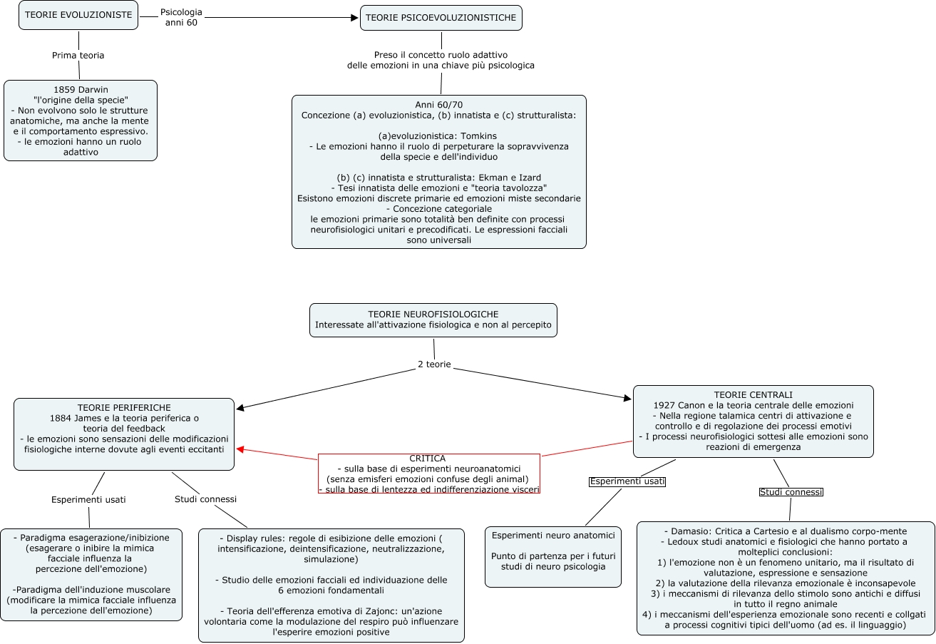 Questa Cmap, creata con IHMC CmapTools, contiene informazioni relative a: 6.0.1. Emozioni neurofisiologiche ed evoluzioniste, TEORIE PERIFERICHE 1884 James e la teoria periferica o teoria del feedback - le emozioni sono sensazioni delle modificazioni fisiologiche interne dovute agli eventi eccitanti Esperimenti usati - Paradigma esagerazione/inibizione (esagerare o inibire la mimica facciale influenza la percezione dell'emozione) -Paradigma dell'induzione muscolare (modificare la mimica facciale influenza la percezione dell'emozione), TEORIE PERIFERICHE 1884 James e la teoria periferica o teoria del feedback - le emozioni sono sensazioni delle modificazioni fisiologiche interne dovute agli eventi eccitanti Studi connessi - Display rules: regole di esibizione delle emozioni ( intensificazione, deintensificazione, neutralizzazione, simulazione) - Studio delle emozioni facciali ed individuazione delle 6 emozioni fondamentali - Teoria dell'efferenza emotiva di Zajonc: un'azione volontaria come la modulazione del respiro può influenzare l'esperire emozioni positive, TEORIE EVOLUZIONISTE Psicologia anni 60 TEORIE PSICOEVOLUZIONISTICHE, TEORIE CENTRALI 1927 Canon e la teoria centrale delle emozioni - Nella regione talamica centri di attivazione e controllo e di regolazione dei processi emotivi - I processi neurofisiologici sottesi alle emozioni sono reazioni di emergenza CRITICA - sulla base di esperimenti neuroanatomici (senza emisferi emozioni confuse degli animal) - sulla base di lentezza ed indifferenziazione visceri TEORIE PERIFERICHE 1884 James e la teoria periferica o teoria del feedback - le emozioni sono sensazioni delle modificazioni fisiologiche interne dovute agli eventi eccitanti, TEORIE NEUROFISIOLOGICHE Interessate all'attivazione fisiologica e non al percepito 2 teorie TEORIE CENTRALI 1927 Canon e la teoria centrale delle emozioni - Nella regione talamica centri di attivazione e controllo e di regolazione dei processi emotivi - I processi neurofisiologici sottesi alle emozioni sono reazioni di emergenza, TEORIE CENTRALI 1927 Canon e la teoria centrale delle emozioni - Nella regione talamica centri di attivazione e controllo e di regolazione dei processi emotivi - I processi neurofisiologici sottesi alle emozioni sono reazioni di emergenza Studi connessi - Damasio: Critica a Cartesio e al dualismo corpo-mente - Ledoux studi anatomici e fisiologici che hanno portato a molteplici conclusioni: 1) l'emozione non è un fenomeno unitario, ma il risultato di valutazione, espressione e sensazione 2) la valutazione della rilevanza emozionale è inconsapevole 3) i meccanismi di rilevanza dello stimolo sono antichi e diffusi in tutto il regno animale 4) i meccanismi dell'esperienza emozionale sono recenti e collgati a processi cognitivi tipici dell'uomo (ad es. il linguaggio), TEORIE CENTRALI 1927 Canon e la teoria centrale delle emozioni - Nella regione talamica centri di attivazione e controllo e di regolazione dei processi emotivi - I processi neurofisiologici sottesi alle emozioni sono reazioni di emergenza Esperimenti usati Esperimenti neuro anatomici Punto di partenza per i futuri studi di neuro psicologia, TEORIE NEUROFISIOLOGICHE Interessate all'attivazione fisiologica e non al percepito 2 teorie TEORIE PERIFERICHE 1884 James e la teoria periferica o teoria del feedback - le emozioni sono sensazioni delle modificazioni fisiologiche interne dovute agli eventi eccitanti, TEORIE PSICOEVOLUZIONISTICHE Preso il concetto ruolo adattivo delle emozioni in una chiave più psicologica Anni 60/70 Concezione (a) evoluzionistica, (b) innatista e (c) strutturalista: (a)evoluzionistica: Tomkins - Le emozioni hanno il ruolo di perpeturare la sopravvivenza della specie e dell'individuo (b) (c) innatista e strutturalista: Ekman e Izard - Tesi innatista delle emozioni e "teoria tavolozza" Esistono emozioni discrete primarie ed emozioni miste secondarie - Concezione categoriale le emozioni primarie sono totalità ben definite con processi neurofisiologici unitari e precodificati. Le espressioni facciali sono universali, TEORIE EVOLUZIONISTE Prima teoria 1859 Darwin "l'origine della specie" - Non evolvono solo le strutture anatomiche, ma anche la mente e il comportamento espressivo. - le emozioni hanno un ruolo adattivo