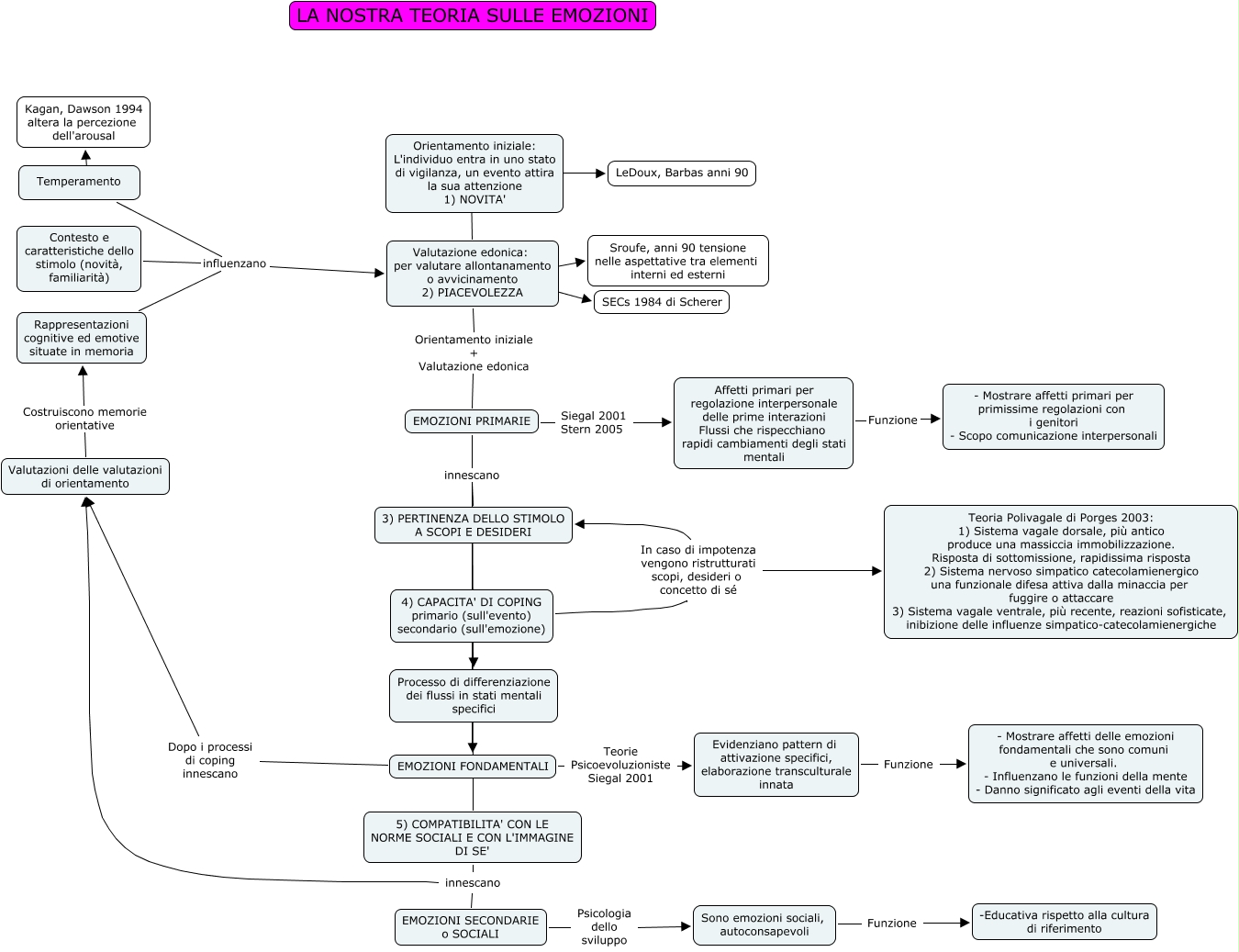 Questa Cmap, creata con IHMC CmapTools, contiene informazioni relative a: 6.1.4. La nostra teoria, EMOZIONI PRIMARIE innescano 4) CAPACITA' DI COPING primario (sull'evento) secondario (sull'emozione), EMOZIONI PRIMARIE Siegal 2001 Stern 2005 Affetti primari per regolazione interpersonale delle prime interazioni Flussi che rispecchiano rapidi cambiamenti degli stati mentali, 4) CAPACITA' DI COPING primario (sull'evento) secondario (sull'emozione) In caso di impotenza vengono ristrutturati scopi, desideri o concetto di sé Teoria Polivagale di Porges 2003: 1) Sistema vagale dorsale, più antico produce una massiccia immobilizzazione. Risposta di sottomissione, rapidissima risposta 2) Sistema nervoso simpatico catecolamienergico una funzionale difesa attiva dalla minaccia per fuggire o attaccare 3) Sistema vagale ventrale, più recente, reazioni sofisticate, inibizione delle influenze simpatico-catecolamienergiche, Valutazioni delle valutazioni di orientamento Costruiscono memorie orientative Rappresentazioni cognitive ed emotive situate in memoria, EMOZIONI PRIMARIE innescano 5) COMPATIBILITA' CON LE NORME SOCIALI E CON L'IMMAGINE DI SE', 5) COMPATIBILITA' CON LE NORME SOCIALI E CON L'IMMAGINE DI SE' innescano EMOZIONI SECONDARIE o SOCIALI, EMOZIONI SECONDARIE o SOCIALI Psicologia dello sviluppo Sono emozioni sociali, autoconsapevoli, Sono emozioni sociali, autoconsapevoli Funzione -Educativa rispetto alla cultura di riferimento, Valutazione edonica: per valutare allontanamento o avvicinamento 2) PIACEVOLEZZA ???? SECs 1984 di Scherer, Orientamento iniziale: L'individuo entra in uno stato di vigilanza, un evento attira la sua attenzione 1) NOVITA' LeDoux, Barbas anni 90, Temperamento ???? Kagan, Dawson 1994 altera la percezione dell'arousal, Contesto e caratteristiche dello stimolo (novità, familiarità) influenzano Valutazione edonica: per valutare allontanamento o avvicinamento 2) PIACEVOLEZZA, Valutazione edonica: per valutare allontanamento o avvicinamento 2) PIACEVOLEZZA Orientamento iniziale + Valutazione edonica EMOZIONI PRIMARIE, EMOZIONI PRIMARIE innescano Processo di differenziazione dei flussi in stati mentali specifici, Affetti primari per regolazione interpersonale delle prime interazioni Flussi che rispecchiano rapidi cambiamenti degli stati mentali Funzione - Mostrare affetti primari per primissime regolazioni con i genitori - Scopo comunicazione interpersonali, EMOZIONI FONDAMENTALI Dopo i processi di coping innescano Valutazioni delle valutazioni di orientamento, 5) COMPATIBILITA' CON LE NORME SOCIALI E CON L'IMMAGINE DI SE' innescano Valutazioni delle valutazioni di orientamento, EMOZIONI PRIMARIE innescano EMOZIONI FONDAMENTALI, Rappresentazioni cognitive ed emotive situate in memoria influenzano Valutazione edonica: per valutare allontanamento o avvicinamento 2) PIACEVOLEZZA, Orientamento iniziale: L'individuo entra in uno stato di vigilanza, un evento attira la sua attenzione 1) NOVITA' ???? Valutazione edonica: per valutare allontanamento o avvicinamento 2) PIACEVOLEZZA