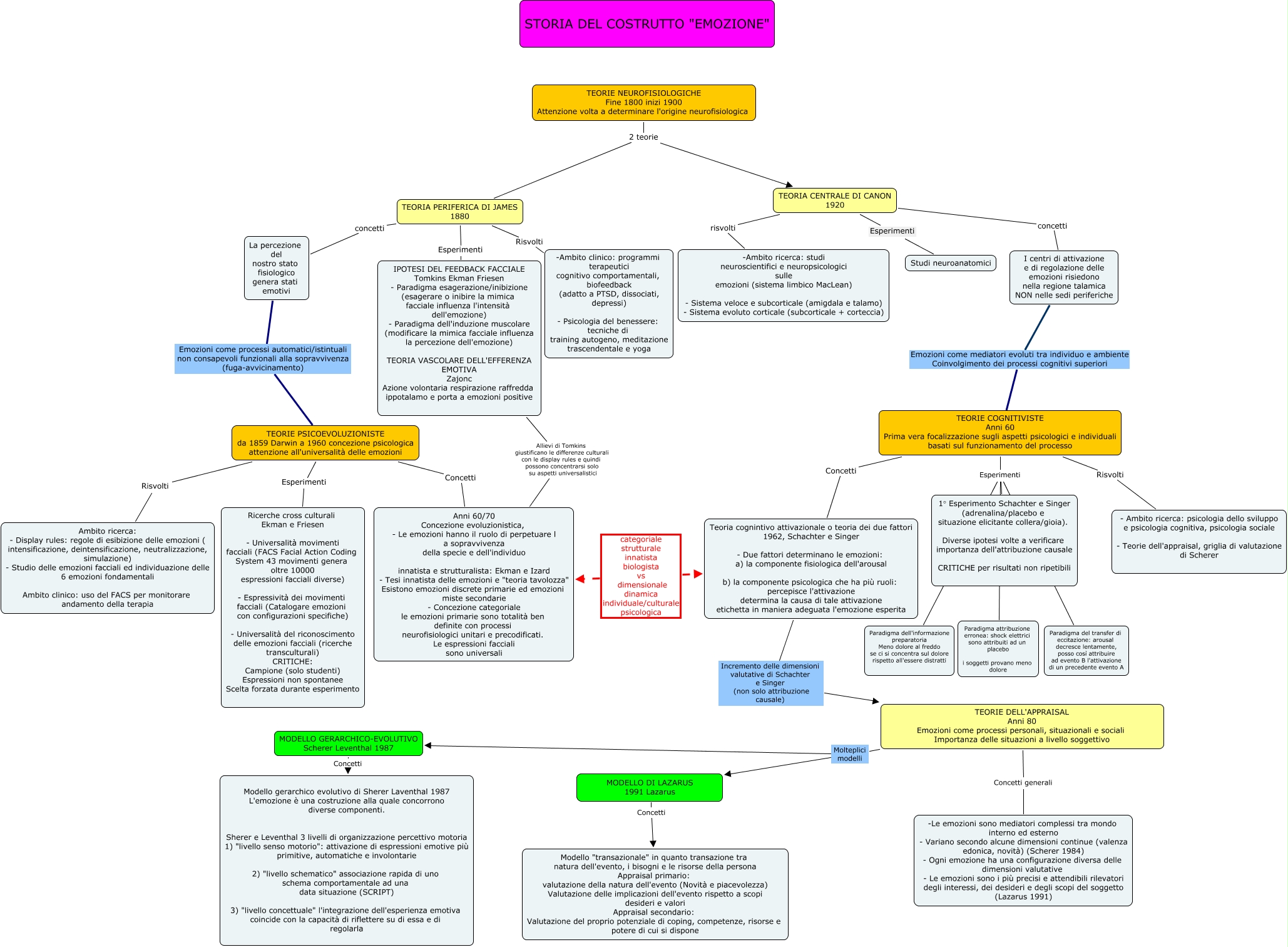 Questa Cmap, creata con IHMC CmapTools, contiene informazioni relative a: 6.1.2. Storia delle emozioni, La percezione del nostro stato fisiologico genera stati emotivi Emozioni come processi automatici/istintuali non consapevoli funzionali alla sopravvivenza (fuga-avvicinamento) TEORIE PSICOEVOLUZIONISTE da 1859 Darwin a 1960 concezione psicologica attenzione all'universalità delle emozioni, I centri di attivazione e di regolazione delle emozioni risiedono nella regione talamica NON nelle sedi periferiche Emozioni come mediatori evoluti tra individuo e ambiente Coinvolgimento dei processi cognitivi superiori TEORIE COGNITIVISTE Anni 60 Prima vera focalizzazione sugli aspetti psicologici e individuali basati sul funzionamento del processo, TEORIE PSICOEVOLUZIONISTE da 1859 Darwin a 1960 concezione psicologica attenzione all'universalità delle emozioni Concetti Anni 60/70 Concezione evoluzionistica, - Le emozioni hanno il ruolo di perpetuare l a sopravvivenza della specie e dell'individuo innatista e strutturalista: Ekman e Izard - Tesi innatista delle emozioni e "teoria tavolozza" Esistono emozioni discrete primarie ed emozioni miste secondarie - Concezione categoriale le emozioni primarie sono totalità ben definite con processi neurofisiologici unitari e precodificati. Le espressioni facciali sono universali, IPOTESI DEL FEEDBACK FACCIALE Tomkins Ekman Friesen - Paradigma esagerazione/inibizione (esagerare o inibire la mimica facciale influenza l'intensità dell'emozione) - Paradigma dell'induzione muscolare (modificare la mimica facciale influenza la percezione dell'emozione) TEORIA VASCOLARE DELL'EFFERENZA EMOTIVA Zajonc Azione volontaria respirazione raffredda ippotalamo e porta a emozioni positive Allievi di Tomkins giustificano le differenze culturali con le display rules e quindi possono concentrarsi solo su aspetti universalistici Anni 60/70 Concezione evoluzionistica, - Le emozioni hanno il ruolo di perpetuare l a sopravvivenza della specie e dell'individuo innatista e strutturalista: Ekman e Izard - Tesi innatista delle emozioni e "teoria tavolozza" Esistono emozioni discrete primarie ed emozioni miste secondarie - Concezione categoriale le emozioni primarie sono totalità ben definite con processi neurofisiologici unitari e precodificati. Le espressioni facciali sono universali, TEORIE COGNITIVISTE Anni 60 Prima vera focalizzazione sugli aspetti psicologici e individuali basati sul funzionamento del processo Esperimenti Paradigma del transfer di eccitazione: arousal decresce lentamente, posso così attribuire ad evento B l'attivazione di un precedente evento A, TEORIE COGNITIVISTE Anni 60 Prima vera focalizzazione sugli aspetti psicologici e individuali basati sul funzionamento del processo Esperimenti 1° Esperimento Schachter e Singer (adrenalina/placebo e situazione elicitante collera/gioia). Diverse ipotesi volte a verificare importanza dell'attribuzione causale CRITICHE per risultati non ripetibili, TEORIA PERIFERICA DI JAMES 1880 Risvolti -Ambito clinico: programmi terapeutici cognitivo comportamentali, biofeedback (adatto a PTSD, dissociati, depressi) - Psicologia del benessere: tecniche di training autogeno, meditazione trascendentale e yoga, TEORIA PERIFERICA DI JAMES 1880 concetti La percezione del nostro stato fisiologico genera stati emotivi, TEORIE COGNITIVISTE Anni 60 Prima vera focalizzazione sugli aspetti psicologici e individuali basati sul funzionamento del processo Risvolti - Ambito ricerca: psicologia dello sviluppo e psicologia cognitiva, psicologia sociale - Teorie dell'appraisal, griglia di valutazione di Scherer, TEORIE DELL'APPRAISAL Anni 80 Emozioni come processi personali, situazionali e sociali Importanza delle situazioni a livello soggettivo Molteplici modelli MODELLO GERARCHICO-EVOLUTIVO Scherer Leventhal 1987, TEORIE NEUROFISIOLOGICHE Fine 1800 inizi 1900 Attenzione volta a determinare l'origine neurofisiologica 2 teorie TEORIA PERIFERICA DI JAMES 1880, MODELLO DI LAZARUS 1991 Lazarus Concetti Modello "transazionale" in quanto transazione tra natura dell'evento, i bisogni e le risorse della persona Appraisal primario: valutazione della natura dell'evento (Novità e piacevolezza) Valutazione delle implicazioni dell'evento rispetto a scopi desideri e valori Appraisal secondario: Valutazione del proprio potenziale di coping, competenze, risorse e potere di cui si dispone, TEORIA PERIFERICA DI JAMES 1880 Esperimenti IPOTESI DEL FEEDBACK FACCIALE Tomkins Ekman Friesen - Paradigma esagerazione/inibizione (esagerare o inibire la mimica facciale influenza l'intensità dell'emozione) - Paradigma dell'induzione muscolare (modificare la mimica facciale influenza la percezione dell'emozione) TEORIA VASCOLARE DELL'EFFERENZA EMOTIVA Zajonc Azione volontaria respirazione raffredda ippotalamo e porta a emozioni positive, TEORIE NEUROFISIOLOGICHE Fine 1800 inizi 1900 Attenzione volta a determinare l'origine neurofisiologica 2 teorie TEORIA CENTRALE DI CANON 1920, MODELLO GERARCHICO-EVOLUTIVO Scherer Leventhal 1987 Concetti Modello gerarchico evolutivo di Sherer Laventhal 1987 L'emozione è una costruzione alla quale concorrono diverse componenti. Sherer e Leventhal 3 livelli di organizzazione percettivo motoria 1) "livello senso motorio": attivazione di espressioni emotive più primitive, automatiche e involontarie 2) "livello schematico" associazione rapida di uno schema comportamentale ad una data situazione (SCRIPT) 3) "livello concettuale" l'integrazione dell'esperienza emotiva coincide con la capacità di riflettere su di essa e di regolarla, TEORIE COGNITIVISTE Anni 60 Prima vera focalizzazione sugli aspetti psicologici e individuali basati sul funzionamento del processo Concetti Teoria cognintivo attivazionale o teoria dei due fattori 1962, Schachter e Singer - Due fattori determinano le emozioni: a) la componente fisiologica dell'arousal b) la componente psicologica che ha più ruoli: percepisce l'attivazione determina la causa di tale attivazione etich