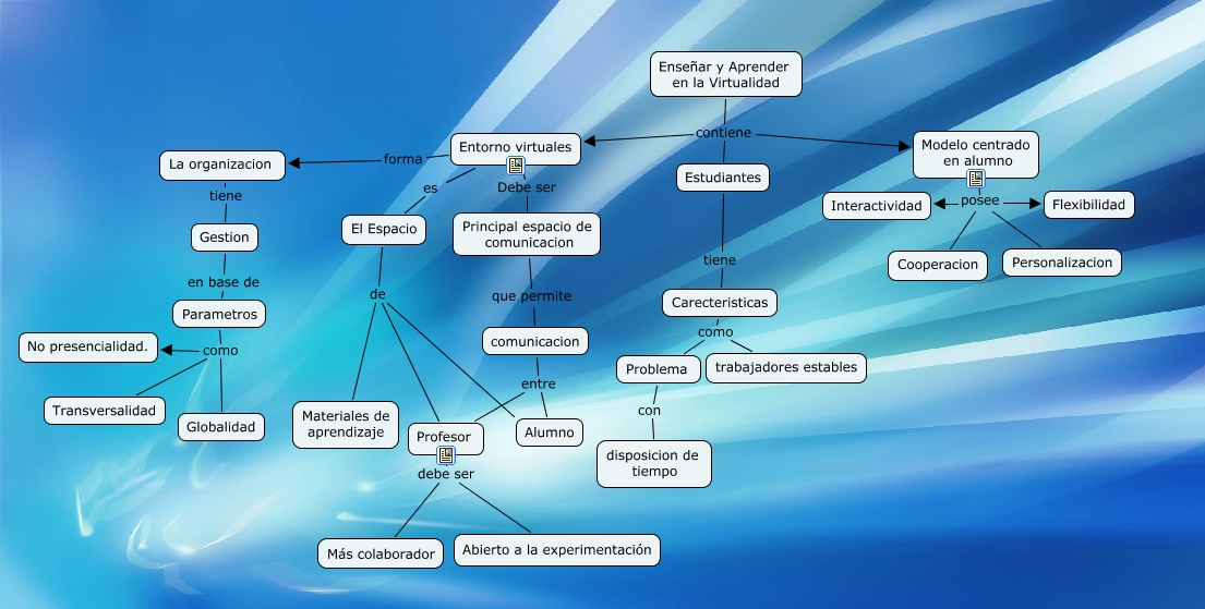 Este Cmap, tiene información relacionada con: Galan maria virginia 2, Principal espacio de comunicacion que permite comunicacion, Enseñar y Aprender en la Virtualidad contiene Modelo centrado en alumno, Parametros como Transversalidad, Carecteristicas como Problema, Problema con disposicion de tiempo, Entorno virtuales forma La organizacion, Carecteristicas como trabajadores estables, Enseñar y Aprender en la Virtualidad contiene Entorno virtuales, comunicacion entre Profesor, El Espacio de Alumno, Parametros como No presencialidad., Profesor debe ser Más colaborador, Enseñar y Aprender en la Virtualidad contiene Estudiantes, Entorno virtuales Debe ser Principal espacio de comunicacion, Estudiantes tiene Carecteristicas, Profesor debe ser Abierto a la experimentación, El Espacio de Profesor, Modelo centrado en alumno posee Flexibilidad, Modelo centrado en alumno posee Interactividad, Entorno virtuales es El Espacio