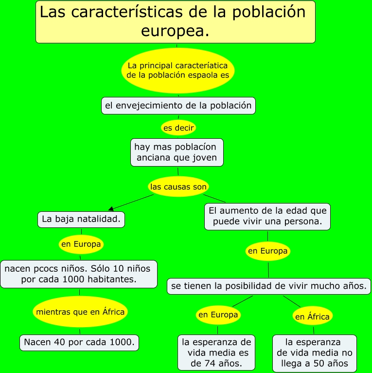 Este Cmap, tiene información relacionada con: Las características de la población europea.cmap, nacen pcocs niños. Sólo 10 niños por cada 1000 habitantes. mientras que en África Nacen 40 por cada 1000., La baja natalidad. en Europa nacen pcocs niños. Sólo 10 niños por cada 1000 habitantes., se tienen la posibilidad de vivir mucho años. en Europa la esperanza de vida media es de 74 años., Las características de la población europea. La principal caracteríatica de la población espaola es el envejecimiento de la población, el envejecimiento de la población es decir hay mas poblacíon anciana que joven, El aumento de la edad que puede vivir una persona. en Europa se tienen la posibilidad de vivir mucho años., se tienen la posibilidad de vivir mucho años. en África la esperanza de vida media no llega a 50 años, hay mas poblacíon anciana que joven las causas son El aumento de la edad que puede vivir una persona., hay mas poblacíon anciana que joven las causas son La baja natalidad.