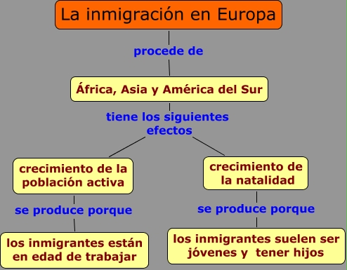 Este Cmap, tiene información relacionada con: La inmigración en Europa, África, Asia y América del Sur tiene los siguientes efectos crecimiento de la población activa, África, Asia y América del Sur tiene los siguientes efectos crecimiento de la natalidad, crecimiento de la natalidad se produce porque los inmigrantes suelen ser jóvenes y tener hijos, La inmigración en Europa procede de África, Asia y América del Sur, crecimiento de la población activa se produce porque los inmigrantes están en edad de trabajar