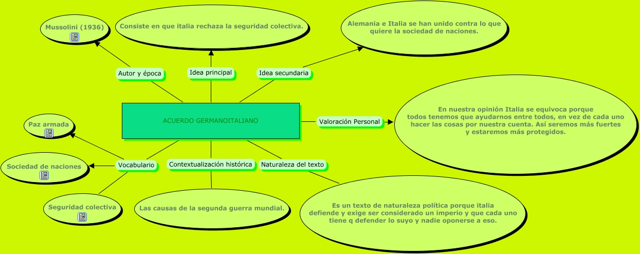 Este Cmap, tiene información relacionada con: comentario de texto 1, ACUERDO GERMANOITALIANO Vocabulario Paz armada, ACUERDO GERMANOITALIANO Contextualización histórica Las causas de la segunda guerra mundial., ACUERDO GERMANOITALIANO Valoración Personal En nuestra opinión Italia se equivoca porque todos tenemos que ayudarnos entre todos, en vez de cada uno hacer las cosas por nuestra cuenta. Así seremos más fuertes y estaremos más protegidos., ACUERDO GERMANOITALIANO Vocabulario Sociedad de naciones, ACUERDO GERMANOITALIANO Idea secundaria Alemania e Italia se han unido contra lo que quiere la sociedad de naciones., ACUERDO GERMANOITALIANO Idea principal Consiste en que italia rechaza la seguridad colectiva., ACUERDO GERMANOITALIANO Vocabulario Seguridad colectiva, ACUERDO GERMANOITALIANO Naturaleza del texto Es un texto de naturaleza política porque italia defiende y exige ser considerado un imperio y que cada uno tiene q defender lo suyo y nadie oponerse a eso., ACUERDO GERMANOITALIANO Autor y época Mussolini (1936)