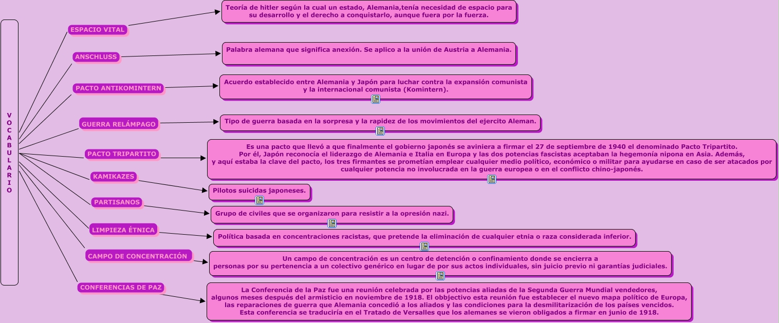 Este Cmap, tiene información relacionada con: Vocabulario, V O C A B U L A R I O PACTO ANTIKOMINTERN Acuerdo establecido entre Alemania y Japón para luchar contra la expansión comunista y la internacional comunista (Komintern)., V O C A B U L A R I O CAMPO DE CONCENTRACIÓN Un campo de concentración es un centro de detención o confinamiento donde se encierra a personas por su pertenencia a un colectivo genérico en lugar de por sus actos individuales, sin juicio previo ni garantías judiciales., V O C A B U L A R I O ESPACIO VITAL Teoría de hitler según la cual un estado, Alemania,tenía necesidad de espacio para su desarrollo y el derecho a conquistarlo, aunque fuera por la fuerza., V O C A B U L A R I O LIMPIEZA ÉTNICA Política basada en concentraciones racistas, que pretende la eliminación de cualquier etnia o raza considerada inferior., V O C A B U L A R I O CONFERENCIAS DE PAZ La Conferencia de la Paz fue una reunión celebrada por las potencias aliadas de la Segunda Guerra Mundial vendedores, algunos meses después del armisticio en noviembre de 1918. El obbjectivo esta reunión fue establecer el nuevo mapa político de Europa, las reparaciones de guerra que Alemania concedió a los aliados y las condiciones para la desmilitarización de los países vencidos. Esta conferencia se traduciría en el Tratado de Versalles que los alemanes se vieron obligados a firmar en junio de 1918., V O C A B U L A R I O KAMIKAZES Pilotos suicidas japoneses., V O C A B U L A R I O PARTISANOS Grupo de civiles que se organizaron para resistir a la opresión nazi., V O C A B U L A R I O GUERRA RELÁMPAGO Tipo de guerra basada en la sorpresa y la rapidez de los movimientos del ejercito Aleman., V O C A B U L A R I O PACTO TRIPARTITO Es una pacto que llevó a que finalmente el gobierno japonés se aviniera a firmar el 27 de septiembre de 1940 el denominado Pacto Tripartito. Por él, Japón reconocía el liderazgo de Alemania e Italia en Europa y las dos potencias fascistas aceptaban la hegemonía nipona en Asia. Además, y aquí estaba la clave del pacto, los tres firmantes se prometían emplear cualquier medio político, económico o militar para ayudarse en caso de ser atacados por cualquier potencia no involucrada en la guerra europea o en el conflicto chino-japonés., V O C A B U L A R I O ANSCHLUSS Palabra alemana que significa anexión. Se aplico a la unión de Austria a Alemania.