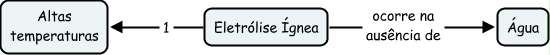 Esse mapa conceitual, produzido no IHMC CmapTools, tem a informação relacionada a: Modelo quest52b, Eletrólise Ígnea ocorre na ausência de Água, Eletrólise Ígnea 1 Altas temperaturas