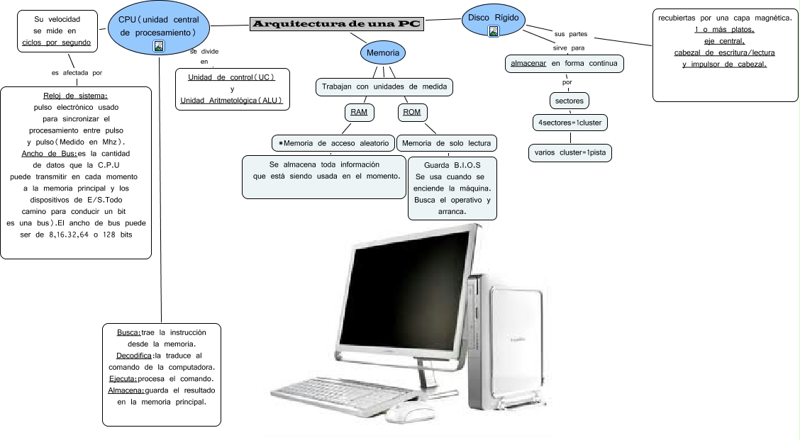 Este Cmap, tiene información relacionada con: Recuperatorio trimestral, CPU(unidad central de procesamiento) Busca:trae la instrucción desde la memoria. Decodifica:la traduce al comando de la computadora. Ejecuta:procesa el comando. Almacena:guarda el resultado en la memoria principal., RAM *Memoria de acceso aleatorio, *Memoria de acceso aleatorio Se almacena toda información que está siendo usada en el momento., Su velocidad se mide en ciclos por segundo es afectada por Reloj de sistema: pulso electrónico usado para sincronizar el procesamiento entre pulso y pulso(Medido en Mhz). Ancho de Bus:es la cantidad de datos que la C.P.U puede transmitir en cada momento a la memoria principal y los dispositivos de E/S.Todo camino para conducir un bit es una bus).El ancho de bus puede ser de 8,16.32,64 o 128 bits, Arquitectura de una PC Memoria, CPU(unidad central de procesamiento) Su velocidad se mide en ciclos por segundo, sectores 4sectores=1cluster, Memoria ROM, Arquitectura de una PC CPU(unidad central de procesamiento), ROM Memoria de solo lectura, Arquitectura de una PC Disco Rígido, almacenar en forma continua por sectores, Disco Rígido sirve para almacenar en forma continua, Memoria Trabajan con unidades de medida, Disco Rígido sus partes recubiertas por una capa magnética. 1 o más platos, eje central, cabezal de escritura/lectura y impulsor de cabezal., 4sectores=1cluster varios cluster=1pista, Memoria de solo lectura Guarda B.I.O.S Se usa cuando se enciende la máquina. Busca el operativo y arranca., CPU(unidad central de procesamiento) se divide en Unidad de control(UC) y Unidad Aritmetológica(ALU), Memoria RAM