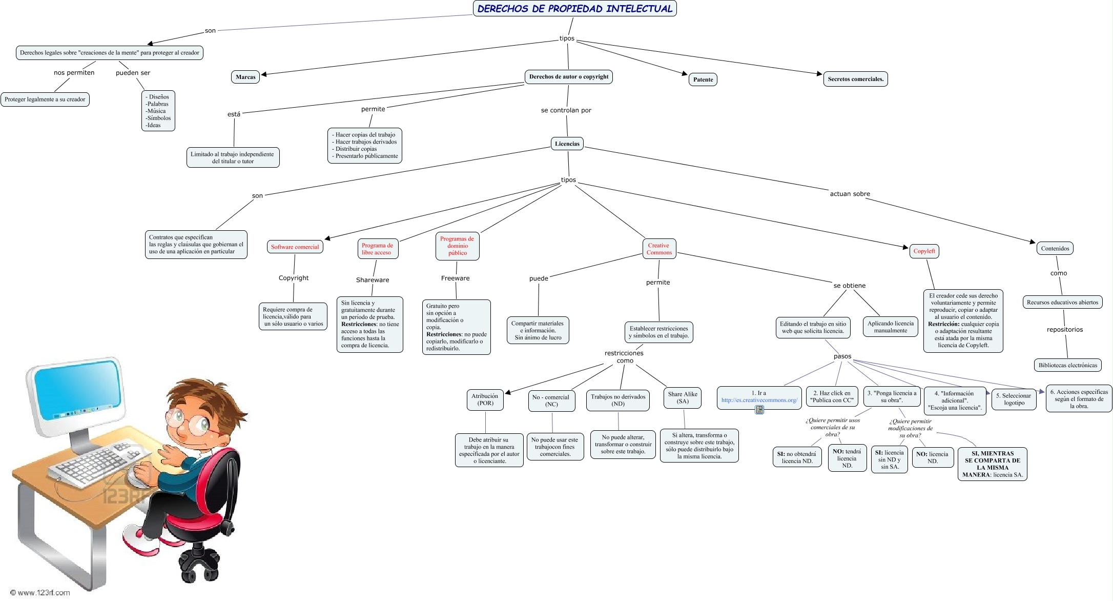 Este Cmap, tiene información relacionada con: mapa, Copyleft ???? El creador cede sus derecho voluntariamente y permite reproducir, copiar o adaptar al usuario el contenido. Restricción: cualquier copia o adaptación resultante está atada por la misma licencia de Copyleft., Recursos educativos abiertos repositorios Bibliotecas electrónicas, DERECHOS DE PROPIEDAD INTELECTUAL tipos Patente, Derechos de autor o copyright está Limitado al trabajo independiente del titular o tutor, Creative Commons se obtiene Aplicando licencia manualmente, No - comercial (NC) ???? No puede usar este trabajocon fines comerciales., Licencias tipos Copyleft, Licencias son Contratos que especifican las reglas y claúsulas que gobiernan el uso de una aplicación en particular, Licencias tipos Creative Commons, Programas de dominio público Freeware Gratuito pero sin opción a modificación o copia. Restricciones: no puede copiarlo, modificarlo o redistribuirlo., Derechos de autor o copyright se controlan por Licencias, 3. "Ponga licencia a su obra". ¿Quiere permitir usos comerciales de su obra? SI: no obtendrá licencia ND., Programa de libre acceso Shareware Sin licencia y gratuitamente durante un período de prueba. Restricciones: no tiene acceso a todas las funciones hasta la compra de licencia., Licencias actuan sobre Contenidos, Editando el trabajo en sitio web que solicita licencia. pasos 5. Seleccionar logotipo, Licencias tipos Programa de libre acceso, DERECHOS DE PROPIEDAD INTELECTUAL tipos Secretos comerciales., Derechos de autor o copyright permite - Hacer copias del trabajo - Hacer trabajos derivados - Distribuir copias - Presentarlo públicamente, Establecer restricciones y símbolos en el trabajo. restricciones como Share Alike (SA), Contenidos como Recursos educativos abiertos