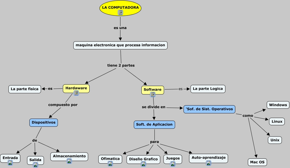 Este Cmap, tiene información relacionada con: La computadora, Software es La parte Logica, Hardaware compuesto por Dispositivos, Soft. de Aplicacion para Ofimatica, Dispositivos de Almacenamiento, 'Sof. de Sist. Operativos como Unix, Software se divide en Soft. de Aplicacion, 'Sof. de Sist. Operativos como Linux, 'Sof. de Sist. Operativos como Windows, LA COMPUTADORA es una maquina electronica que procesa informacion, Soft. de Aplicacion para Diseño Grafico, Hardaware es La parte fisica, 'Sof. de Sist. Operativos como Mac OS, maquina electronica que procesa informacion tiene 2 partes Hardaware, Dispositivos de Entrada, Dispositivos de Salida, Software se divide en 'Sof. de Sist. Operativos, Soft. de Aplicacion para Juegos, maquina electronica que procesa informacion tiene 2 partes Software, Soft. de Aplicacion para Auto-aprendizaje
