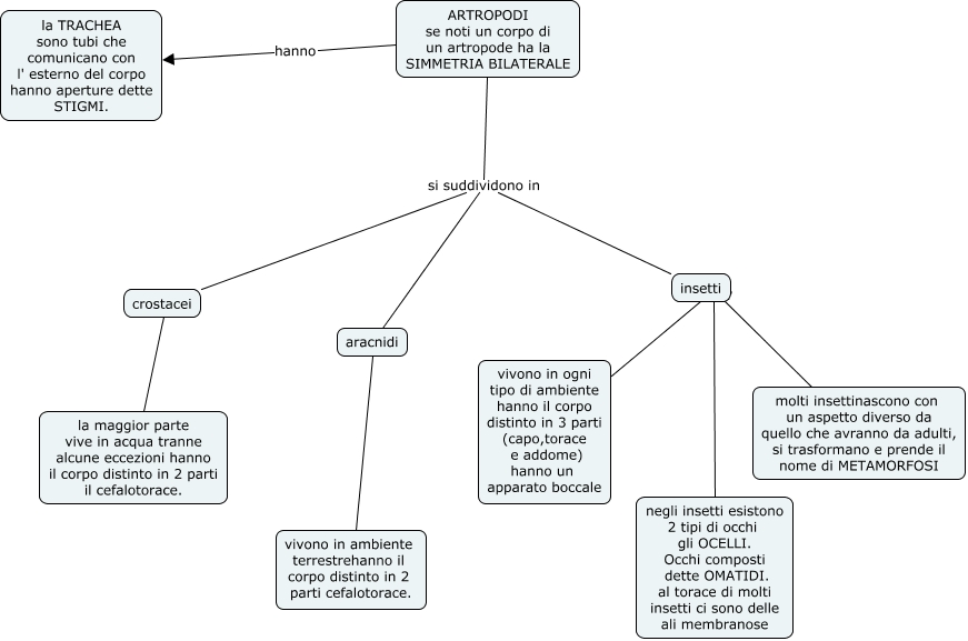 Questa Cmap, creata con IHMC CmapTools, contiene informazioni relative a: ARTROPODI mattia, ARTROPODI se noti un corpo di un artropode ha la SIMMETRIA BILATERALE si suddividono in crostacei, insetti ???? vivono in ogni tipo di ambiente hanno il corpo distinto in 3 parti (capo,torace e addome) hanno un apparato boccale, aracnidi ???? vivono in ambiente terrestrehanno il corpo distinto in 2 parti cefalotorace., ARTROPODI se noti un corpo di un artropode ha la SIMMETRIA BILATERALE si suddividono in insetti, crostacei ???? la maggior parte vive in acqua tranne alcune eccezioni hanno il corpo distinto in 2 parti il cefalotorace., ARTROPODI se noti un corpo di un artropode ha la SIMMETRIA BILATERALE si suddividono in aracnidi, insetti ???? molti insettinascono con un aspetto diverso da quello che avranno da adulti, si trasformano e prende il nome di METAMORFOSI, ARTROPODI se noti un corpo di un artropode ha la SIMMETRIA BILATERALE hanno la TRACHEA sono tubi che comunicano con l' esterno del corpo hanno aperture dette STIGMI., insetti ???? negli insetti esistono 2 tipi di occhi gli OCELLI. Occhi composti dette OMATIDI. al torace di molti insetti ci sono delle ali membranose