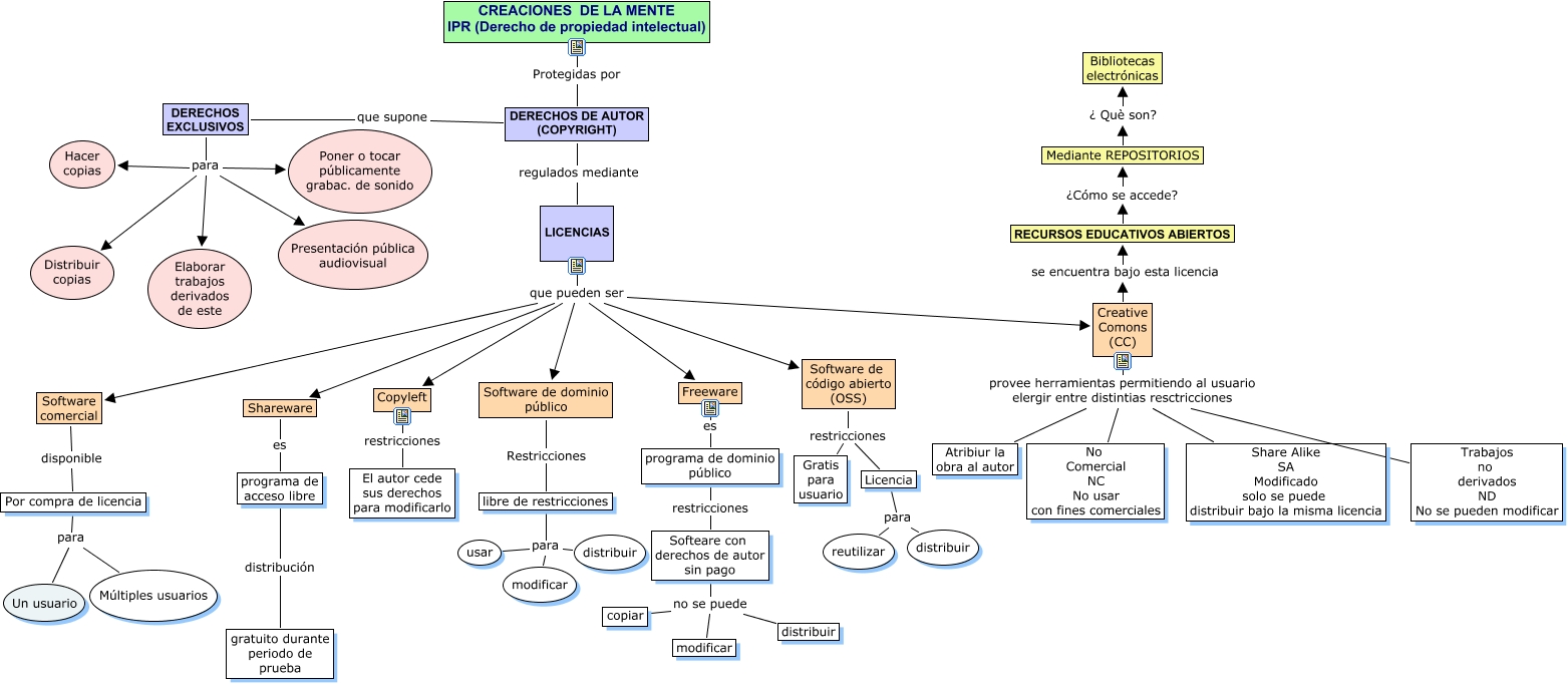 Este Cmap, tiene información relacionada con: Creaciones de la Mente, Licencia para distribuir, LICENCIAS que pueden ser Shareware, Creative Comons (CC) provee herramientas permitiendo al usuario elergir entre distintias resctricciones No Comercial NC No usar con fines comerciales, LICENCIAS que pueden ser Copyleft, LICENCIAS que pueden ser Software de código abierto (OSS), LICENCIAS que pueden ser Creative Comons (CC), LICENCIAS que pueden ser Freeware, RECURSOS EDUCATIVOS ABIERTOS ¿Cómo se accede? Mediante REPOSITORIOS, Shareware es programa de acceso libre, Creative Comons (CC) provee herramientas permitiendo al usuario elergir entre distintias resctricciones Atribiur la obra al autor, Creative Comons (CC) provee herramientas permitiendo al usuario elergir entre distintias resctricciones Share Alike SA Modificado solo se puede distribuir bajo la misma licencia, DERECHOS EXCLUSIVOS para Poner o tocar públicamente grabac. de sonido, programa de dominio público restricciones Softeare con derechos de autor sin pago, Softeare con derechos de autor sin pago no se puede copiar, Software de código abierto (OSS) restricciones Licencia, DERECHOS DE AUTOR (COPYRIGHT) que supone DERECHOS EXCLUSIVOS, Por compra de licencia para Múltiples usuarios, programa de acceso libre distribución gratuito durante periodo de prueba, libre de restricciones para distribuir, DERECHOS EXCLUSIVOS para Distribuir copias