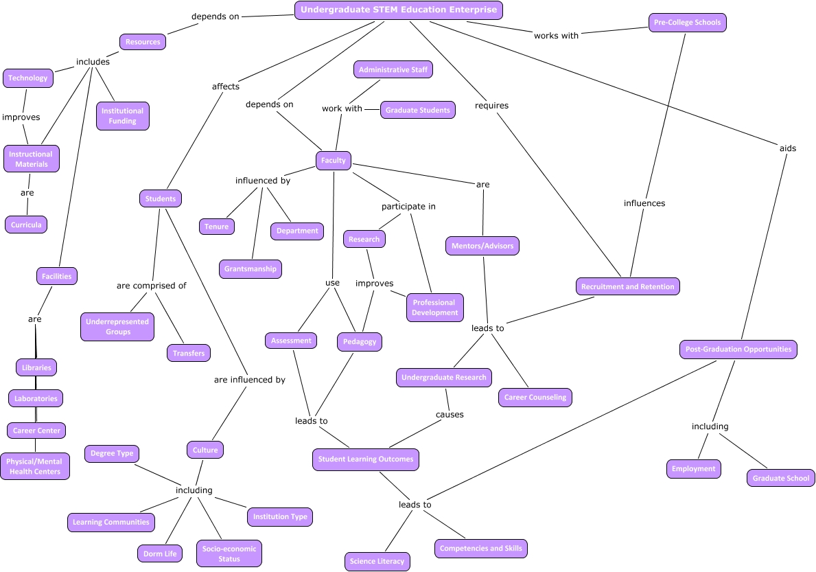 This Concept Map, created with IHMC CmapTools, has information related to: Undergraduate STEM Education Enterprise-Science Assistant Example, Faculty influenced by Grantsmanship, Post-Graduation Opportunities including Graduate School, Culture including Learning Communities, Undergraduate STEM Education Enterprise requires Recruitment and Retention, Facilities are Laboratories, Students are comprised of Underrepresented Groups, Faculty influenced by Tenure, Undergraduate STEM Education Enterprise affects Students, Faculty participate in Research, Faculty participate in Professional Development, Faculty are Mentors/Advisors, Student Learning Outcomes leads to Science Literacy, Undergraduate Research causes Student Learning Outcomes, Pedagogy leads to Student Learning Outcomes, Technology includes Facilities, Post-Graduation Opportunities including Employment, Resources includes Facilities, Mentors/Advisors leads to Undergraduate Research, Culture including Dorm Life, Faculty use Pedagogy