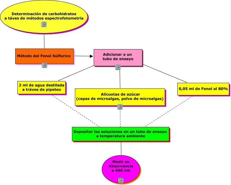 Este Cmap, tiene información relacionada con: metodo fenol sulfurico kkk, Determinación de carbohidratos a táves de métodos espectrofotometría ???? Método del Fenol Súlfurico, Alícuotas de azúcar (cepas de microalgas, polvo de microalgas) ???? Depositar las soluciones en un tubo de ensayo a temperatura ambiente, Adicionar a un tubo de ensayo ???? 2 ml de agua destilada a tráves de pipeteo, Adicionar a un tubo de ensayo ???? 0,05 ml de Fenol al 80%, Depositar las soluciones en un tubo de ensayo a temperatura ambiente ???? Medir su Absorvancia a 490 nm, Método del Fenol Súlfurico ???? Adicionar a un tubo de ensayo, 0,05 ml de Fenol al 80% ???? Depositar las soluciones en un tubo de ensayo a temperatura ambiente, Adicionar a un tubo de ensayo ???? Alícuotas de azúcar (cepas de microalgas, polvo de microalgas), 2 ml de agua destilada a tráves de pipeteo ???? Depositar las soluciones en un tubo de ensayo a temperatura ambiente