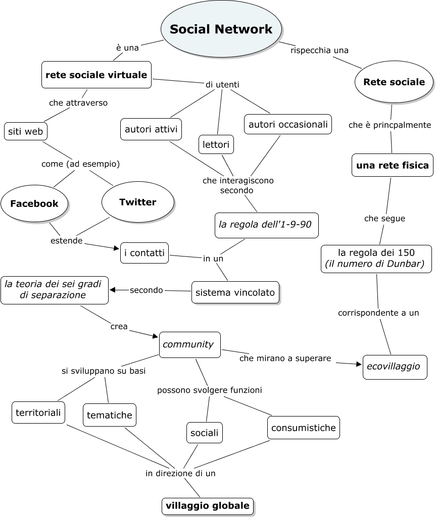 Questa Cmap, creata con IHMC CmapTools, contiene informazioni relative a: Social Network, la regola dei 150 (il numero di Dunbar) corrispondente a un ecovillaggio, la regola dell'1-9-90 in un sistema vincolato, tematiche in direzione di un villaggio globale, Rete sociale che è princpalmente una rete fisica, rete sociale virtuale che attraverso siti web, community si sviluppano su basi tematiche, community possono svolgere funzioni consumistiche, Social Network è una rete sociale virtuale, consumistiche in direzione di un villaggio globale, rete sociale virtuale di utenti lettori, i contatti in un sistema vincolato, siti web come (ad esempio) Facebook, Facebook estende i contatti, community che mirano a superare ecovillaggio, sociali in direzione di un villaggio globale, siti web come (ad esempio) Twitter, rete sociale virtuale di utenti autori occasionali, territoriali in direzione di un villaggio globale, rete sociale virtuale di utenti autori attivi, sistema vincolato secondo la teoria dei sei gradi di separazione