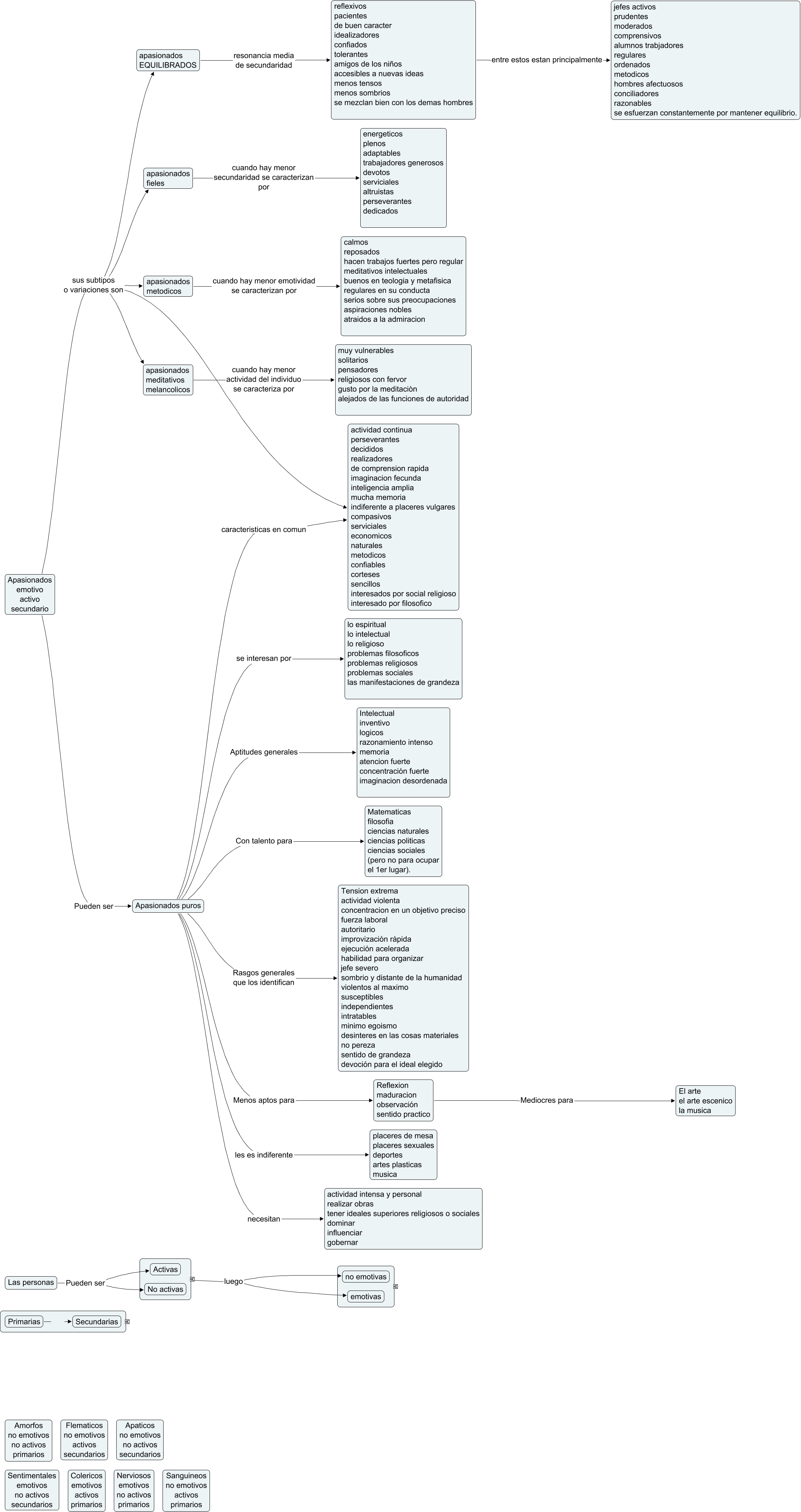 This Concept Map, created with IHMC CmapTools, has information related to: caracteres, Apasionados puros Menos aptos para Reflexion maduracion observación sentido practico, Apasionados emotivo activo secundario sus subtipos o variaciones son apasionados metodicos, ???? luego emotivas, Apasionados emotivo activo secundario Pueden ser Apasionados puros, Apasionados puros Con talento para Matematicas filosofia ciencias naturales ciencias politicas ciencias sociales (pero no para ocupar el 1er lugar)., Reflexion maduracion observación sentido practico Mediocres para El arte el arte escenico la musica, Primarias Y/o Secundarias, Apasionados emotivo activo secundario sus subtipos o variaciones son apasionados fieles, Apasionados emotivo activo secundario sus subtipos o variaciones son actividad continua perseverantes decididos realizadores de comprension rapida imaginacion fecunda inteligencia amplia mucha memoria indiferente a placeres vulgares compasivos serviciales economicos naturales metodicos confiables corteses sencillos interesados por social religioso interesado por filosofico, reflexivos pacientes de buen caracter idealizadores confiados tolerantes amigos de los niños accesibles a nuevas ideas menos tensos menos sombrios se mezclan bien con los demas hombres entre estos estan principalmente jefes activos prudentes moderados comprensivos alumnos trabjadores regulares ordenados metodicos hombres afectuosos conciliadores razonables se esfuerzan constantemente por mantener equilibrio., Apasionados puros caracteristicas en comun actividad continua perseverantes decididos realizadores de comprension rapida imaginacion fecunda inteligencia amplia mucha memoria indiferente a placeres vulgares compasivos serviciales economicos naturales metodicos confiables corteses sencillos interesados por social religioso interesado por filosofico, ???? luego no emotivas, Apasionados puros Rasgos generales que los identifican Tension extrema actividad violenta concentracion en un objetivo preciso fuerza laboral autoritario improvización rápida ejecución acelerada habilidad para organizar jefe severo sombrio y distante de la humanidad violentos al maximo susceptibles independientes intratables minimo egoismo desinteres en las cosas materiales no pereza sentido de grandeza devoción para el ideal elegido, Apasionados puros se interesan por lo espiritual lo intelectual lo religioso problemas filosoficos problemas religiosos problemas sociales las manifestaciones de grandeza, apasionados metodicos cuando hay menor emotividad se caracterizan por calmos reposados hacen trabajos fuertes pero regular meditativos intelectuales buenos en teologia y metafisica regulares en su conducta serios sobre sus preocupaciones aspiraciones nobles atraidos a la admiracion, apasionados EQUILIBRADOS resonancia media de secundaridad reflexivos pacientes de buen caracter idealizadores confiados tolerantes amigos de los niños accesibles a nuevas ideas menos tensos menos sombrios se mezclan bien con los demas hombres, apasionados meditativos melancolicos cuando hay menor actividad del individuo se caracteriza por muy vulnerables solitarios pensadores religiosos con fervor gusto por la meditaciòn alejados de las funciones de autoridad, Apasionados puros les es indiferente placeres de mesa placeres sexuales deportes artes plasticas musica, Apasionados emotivo activo secundario sus subtipos o variaciones son apasionados EQUILIBRADOS, Apasionados puros necesitan actividad intensa y personal realizar obras tener ideales superiores religiosos o sociales dominar influenciar gobernar