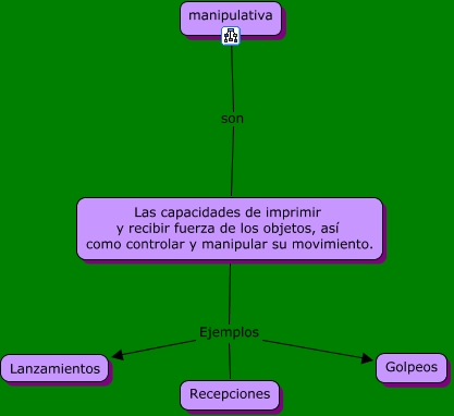 Este Cmap, tiene información relacionada con: manipulativa, Las capacidades de imprimir y recibir fuerza de los objetos, así como controlar y manipular su movimiento. Ejemplos Recepciones, Las capacidades de imprimir y recibir fuerza de los objetos, así como controlar y manipular su movimiento. Ejemplos Lanzamientos, Las capacidades de imprimir y recibir fuerza de los objetos, así como controlar y manipular su movimiento. Ejemplos Golpeos, manipulativa son Las capacidades de imprimir y recibir fuerza de los objetos, así como controlar y manipular su movimiento.