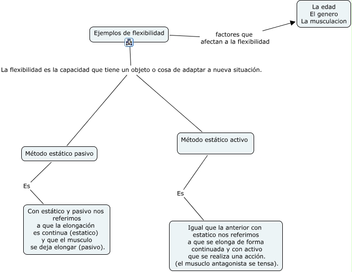 Este Cmap, tiene información relacionada con: Ejemplos de flexibilidad, Ejemplos de flexibilidad La flexibilidad es la capacidad que tiene un objeto o cosa de adaptar a nueva situación. Método estático activo, Método estático activo Es Igual que la anterior con estatico nos referimos a que se elonga de forma continuada y con activo que se realiza una acción. (el musuclo antagonista se tensa)., Ejemplos de flexibilidad factores que afectan a la flexibilidad La edad El genero La musculacion, Método estático pasivo Es Con estático y pasivo nos referimos a que la elongación es continua (estatico) y que el musculo se deja elongar (pasivo)., Ejemplos de flexibilidad La flexibilidad es la capacidad que tiene un objeto o cosa de adaptar a nueva situación. Método estático pasivo