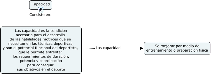 Este Cmap, tiene información relacionada con: capacidad, Las capacidad es la condicion necesaria para el desarrollo de las habilidades motrices que se necesitan en las técnicas deportivas, y son el potencial funcional del deportista, que le permite enfrentar los requerimientos de duración, potencia y coordinación para conseguir sus objetivos en el deporte Las capacidad Se mejorar por medio de entrenamiento o preparación física, Capacidad Consiste en: Las capacidad es la condicion necesaria para el desarrollo de las habilidades motrices que se necesitan en las técnicas deportivas, y son el potencial funcional del deportista, que le permite enfrentar los requerimientos de duración, potencia y coordinación para conseguir sus objetivos en el deporte