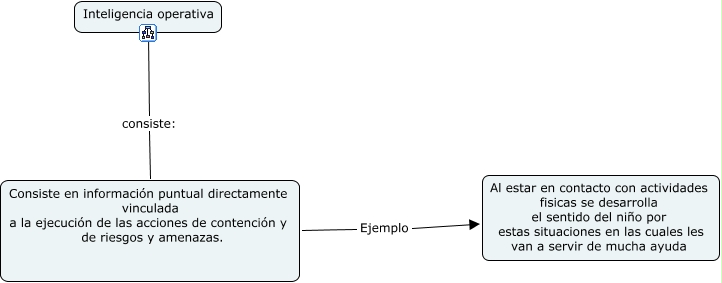 Este Cmap, tiene información relacionada con: inteligencia operativa, Inteligencia operativa consiste: Consiste en información puntual directamente vinculada a la ejecución de las acciones de contención y de riesgos y amenazas., Consiste en información puntual directamente vinculada a la ejecución de las acciones de contención y de riesgos y amenazas. Ejemplo Al estar en contacto con actividades fisicas se desarrolla el sentido del niño por estas situaciones en las cuales les van a servir de mucha ayuda